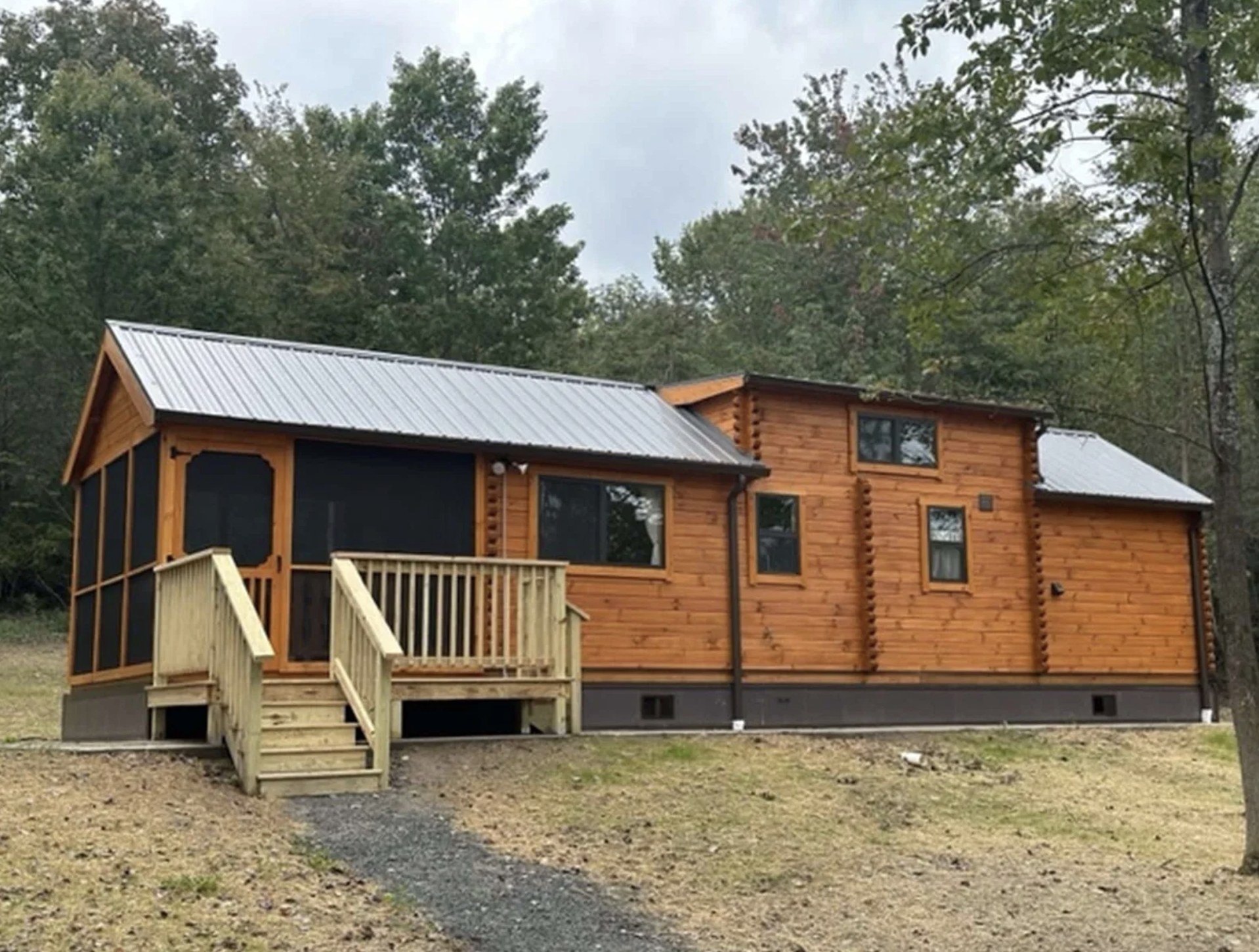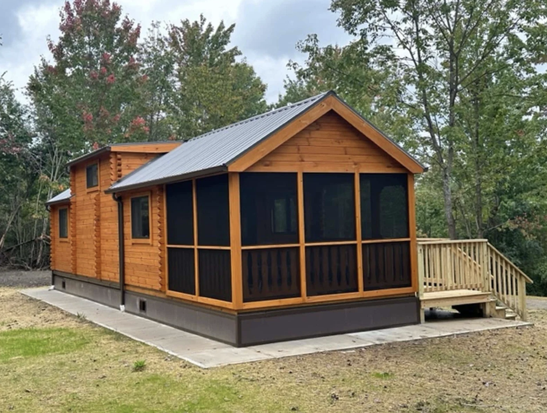 | Style | Park Model Log Cabin with screened-in porch and loft |