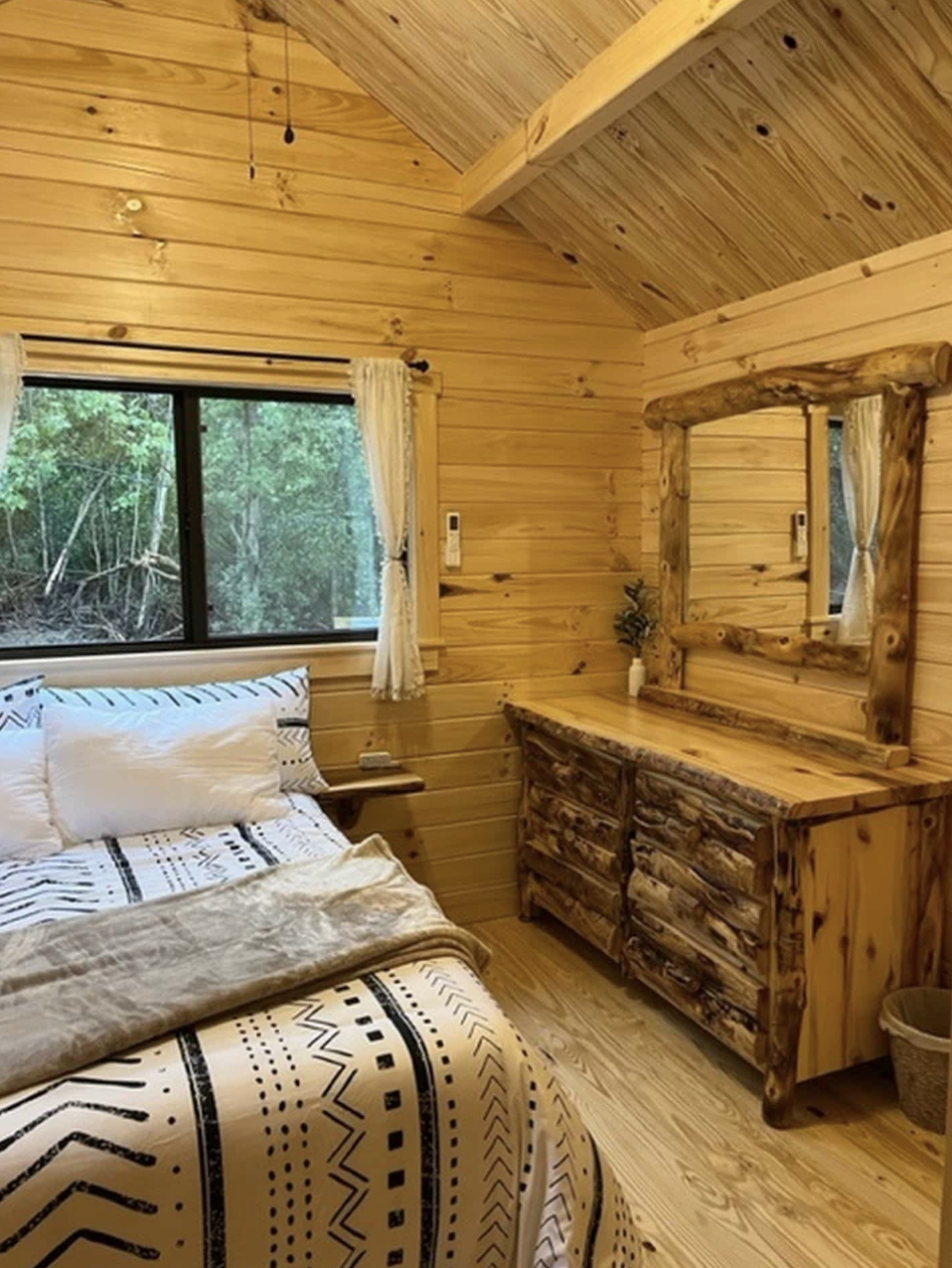 The bedroom located on the first floor is the main one and it focuses on giving you a good sleep experience. At the backside, it is far away from noise and the size itself is just right. What completes the all-wood interior are the furniture that look like raw wood and reflect a perfect blend of luxury and rustic charm at the same time.