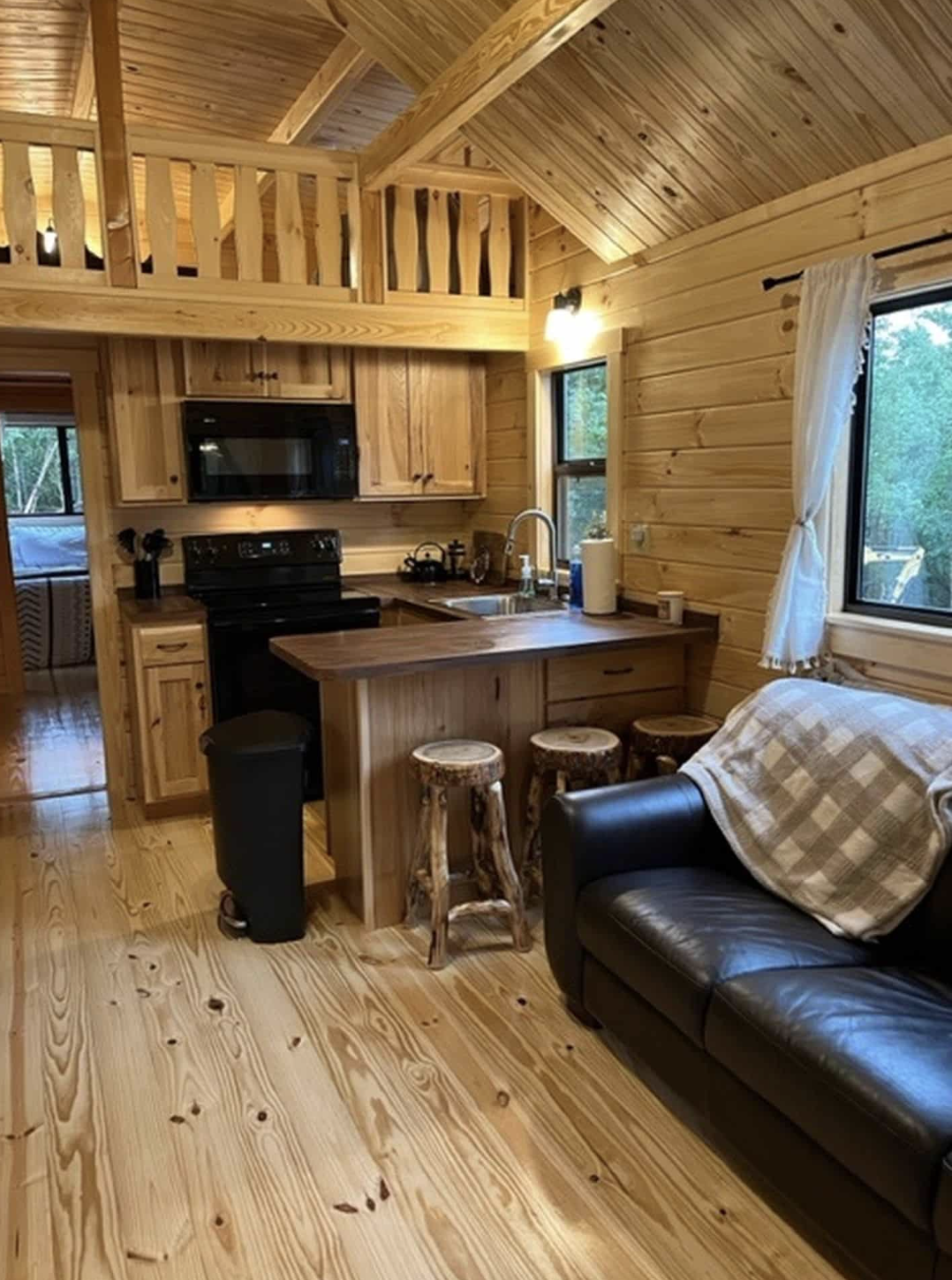 The living room is nicely sized with its tall ceiling and lots of natural light that makes everyone feel at home. It is comfortable and functional making the entire room more spacious and inviting. The color of the wood and other elements add the feeling of warmth that is not heavy and still makes the desire stay for longer.Offering the best with a rustic twist is what makes this cabin come alive. Storage has been provided in the form of cabinets and countertops that are spacious enough. The layout is thought through so as to be of maximum help to the person working. The kitchen, thus, remains not only a working place but also a source of great pleasure.