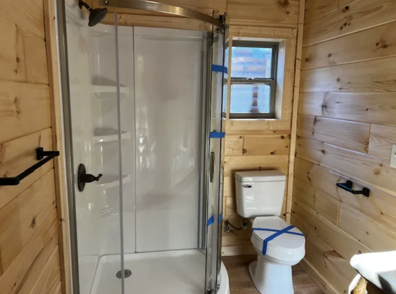 A finished interior is what the park model cabin offers but it is not fully furnished which allows potential owners the chance to mold the cabin to their specific tastes and needs. One bedroom and one bathroom are part of the layout, with the living room and the kitchen being one together. The interior is done up with 1×8 tongue-and-groove white pine boards on the walls and ceiling, LifeProof laminate flooring in Fresh Oak, and kitchen cabinets made of Colorado Aspen. A corner shower with toilet and vanity, along with a tankless water heater and washer/dryer hookup, bring in a touch of modern luxury.