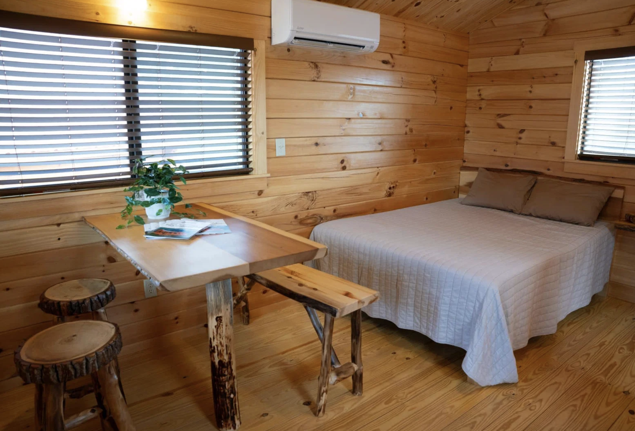 A functional bath and kitchenette are furnished inside this cabin. The living space is planned in such a way to get the best out of the 200 square foot area, giving it a warm and efficient room. The kitchenette is simply done for cooking light meals, and the bathroom has rustic fittings that add a nice touch. The bedroom area with drawers underneath is a clever way to store things. Besides this, a 32” TV and window blinds are modern features bound to be appreciated. Since the décor is excluded, the owners can go wild with their imagination when it comes to the style of the cabin.