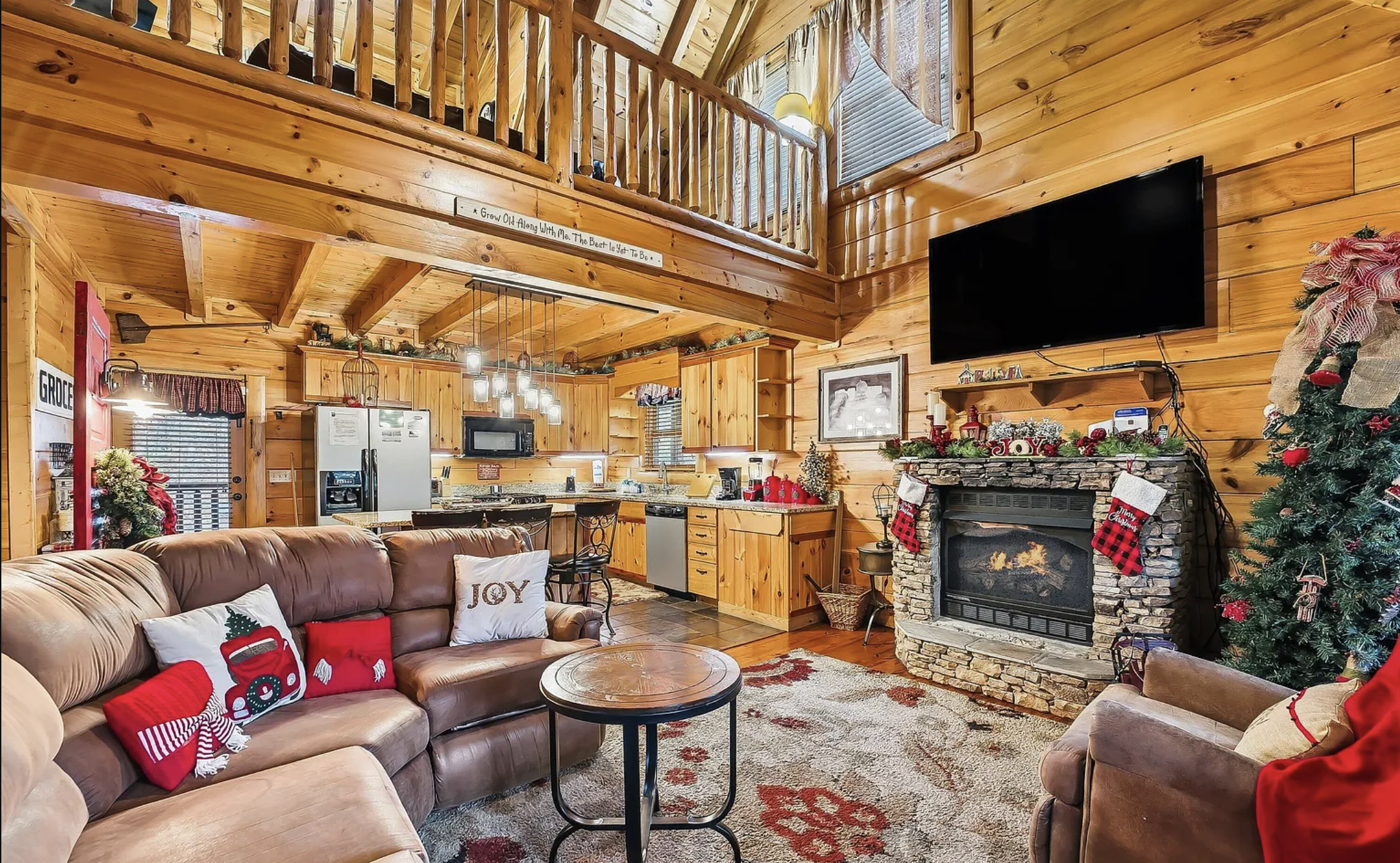 With a breakfast bar and a spacious primary suite, an open floor plan provides layers of discovery—the loft a bird’s-eye view, the recreation area a lively hub, the deck a bridge to the wild. The cabin is one where the interiors’ rustic luxury like log walls, stone accents, warm lighting, etc. is in harmony with the exteriors’ natural embrace, a place that is equally beautiful in its solitude as well as in its shared joy, and the mountain views from every window are the reminder that you are not only living in the cabin but you are living with nature.