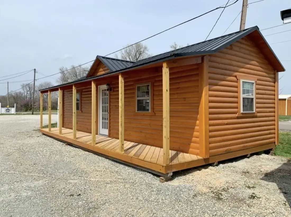 The exterior features rich log-style wood siding with a clean, natural appearance. A welcoming porch adds both visual appeal and usable outdoor space, while the sturdy construction ensures the cabin can withstand various weather conditions. The overall proportions feel balanced and substantial, allowing the cabin to blend naturally into many different environments while maintaining its distinctive character. This cabin model starts from $31,900.