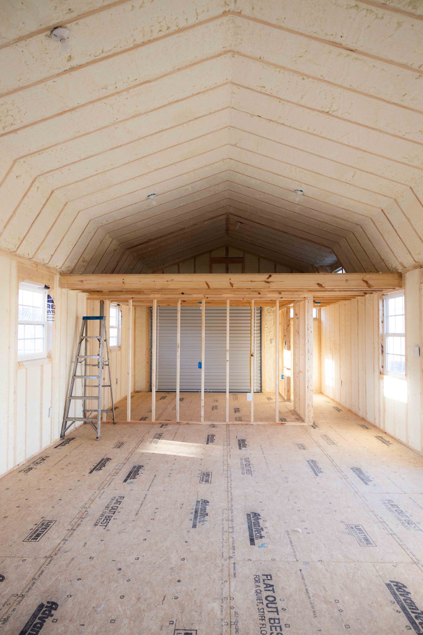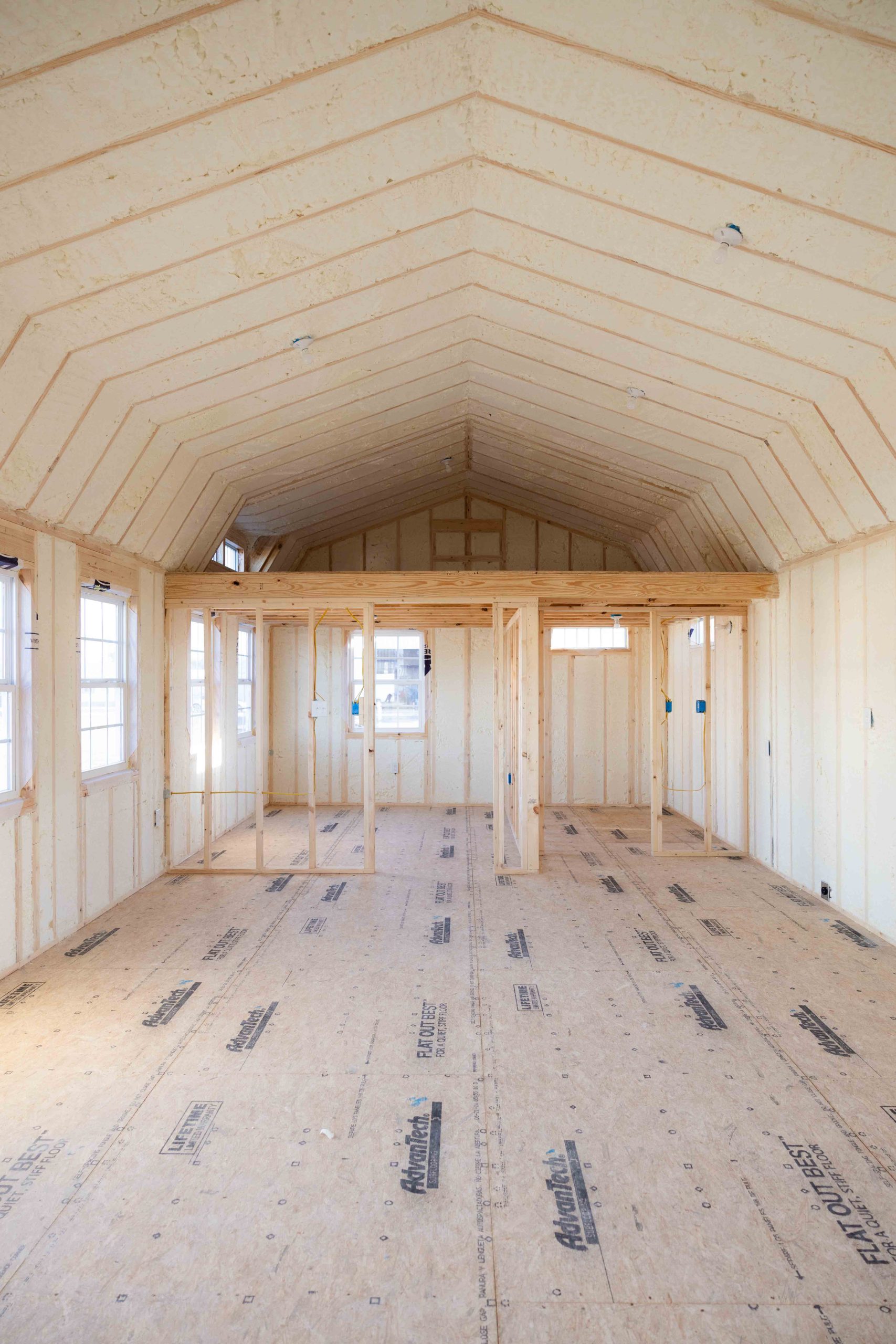 Inside, the unfinished interior is a blank canvas waiting for your personal touch. Spanning 800 square feet, the cabin features lofts at both ends, each with 6-foot dormers tucked under the top plate, providing ample room for cozy bedrooms, a quiet study, or clever storage solutions. The engineered tongue-and-groove flooring offers a solid foundation, while full spray foam insulation ensures comfort and energy efficiency year-round. A comprehensive electrical package is included, ready to support your modern needs, from sleek lighting to high-tech appliances.