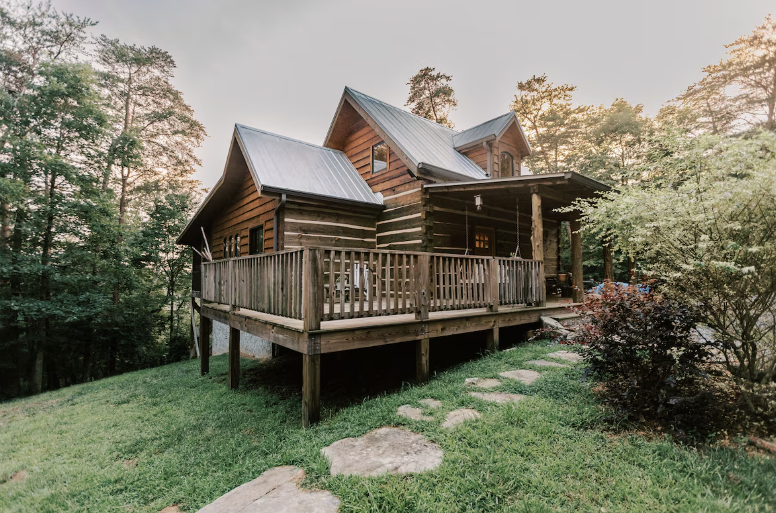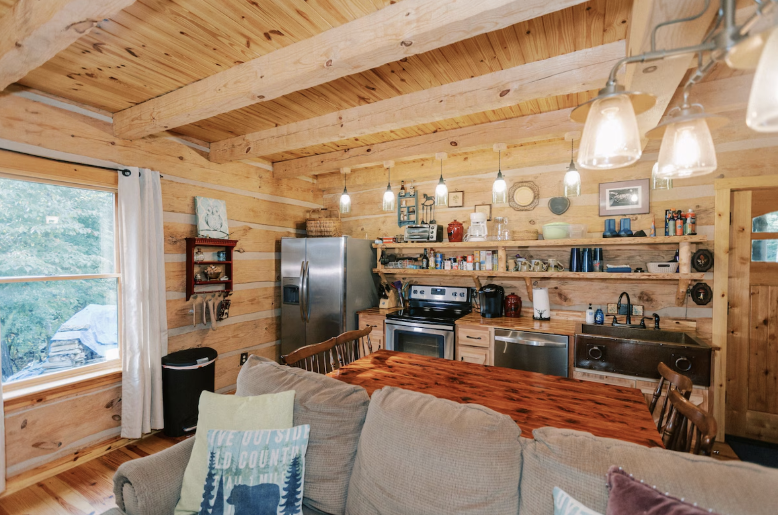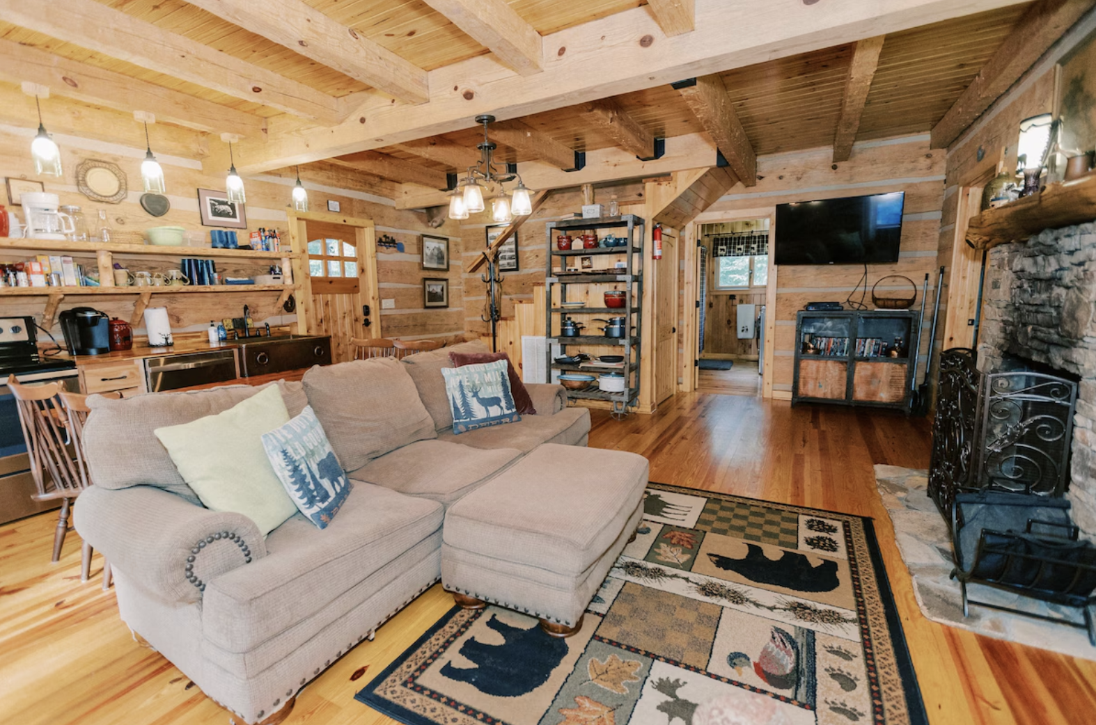 The Valkyrie Secluded Romantic River Cabin in Mentone, Alabama, is a wonderful marriage of mountain romance and rustic luxury. Here, a large log-stone retreat gives the open living space a river-like flow through the trees.The host paired natural logs with stone accents, a fireplace, and great views in this lovely cabin, which truly embodies the soul of Lookout Mountain. The main attraction for us has always been how the warm materials glow in the afternoon sun, the high ceilings that make the space feel alive with the forest, and the exposed details that carry the warmth of traditional craftsmanship.