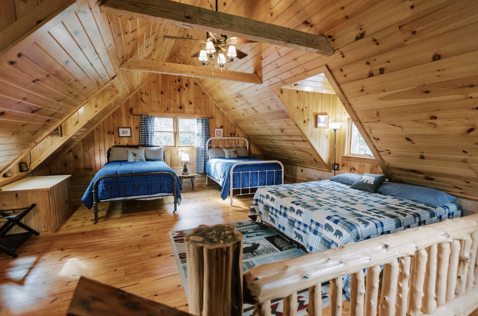 The two bedrooms were designed as havens for sleep and restoration, each offering a quiet refuge within the cabin that warmly embraces you. The master bedroom is a peaceful retreat featuring a king-size bed, which is against bare natural walls, a lot of closet space for household linens and your wardrobe, and direct access to a full bathroom equipped with modern fixtures and tiled floor. The other bedroom can be a home to two queen-size beds and it even has space for dressers. The sloped ceiling lends the room a treehouse-like charm which is ideal for a guest or a child who appreciates the magical feeling of a cosy hideout. The two bathrooms with their tub/shower, vanity and the new fixtures are the main reasons why your morning hygiene sessions can proceed without any disturbances or stress. The cabin’s rational components, such as convenient main floor laundry, the warm fireplace on the chilly evenings, as well as the ceiling fans in a summertime, make it seem like an existence where everything works out naturally. Herein lays the beauty that comes from a perfect harmony between the spirit of rustic and modern ease.
