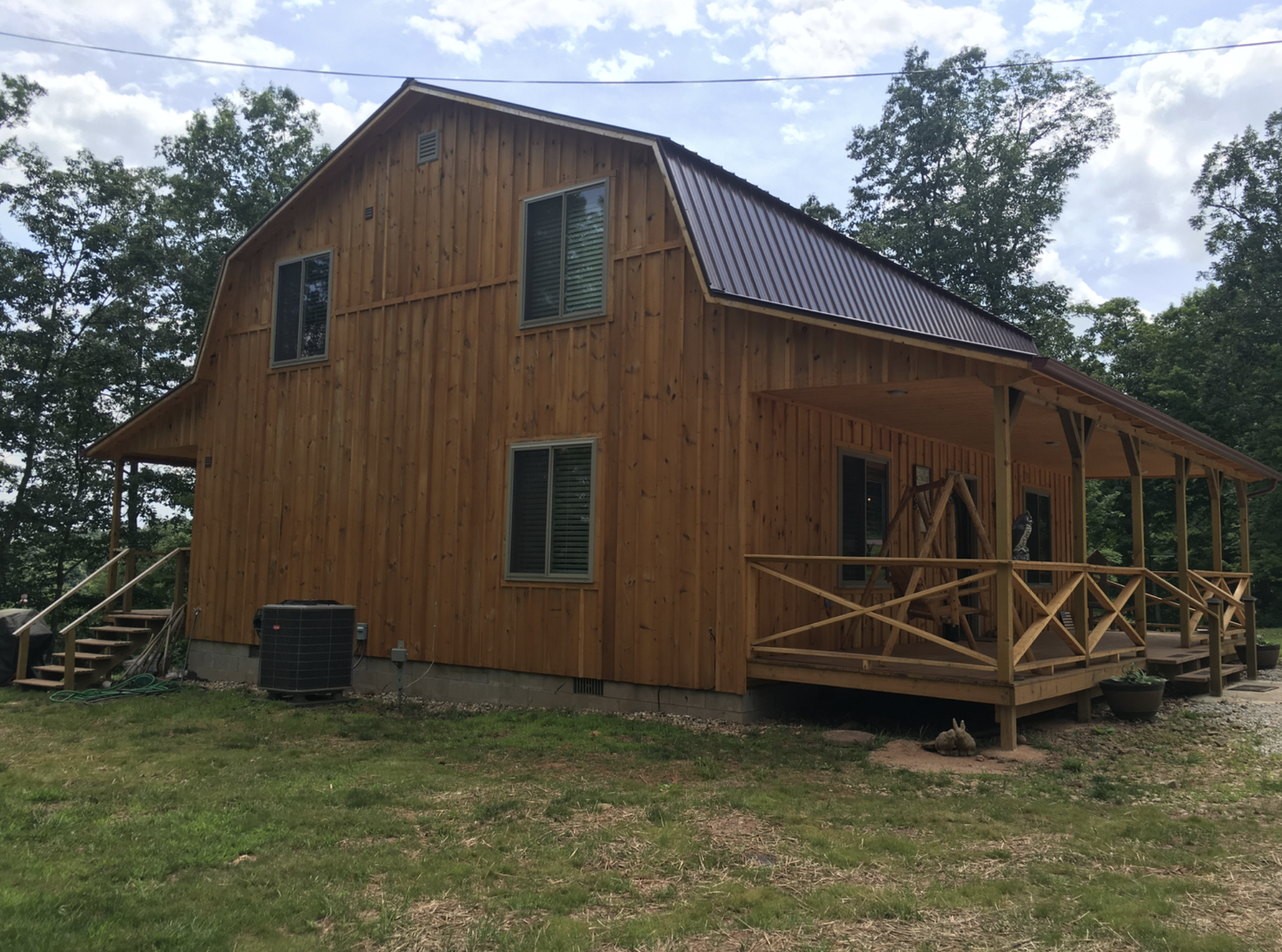 The outside of the cabin shows a house shape done in the classic gambrel style. This is one of the best roof styles for getting a lot of space inside while still preserving the overall look of a country barn which is what it is very much reminiscent of.
