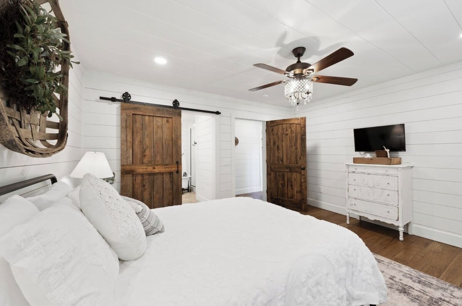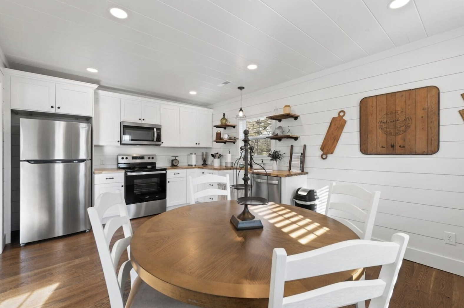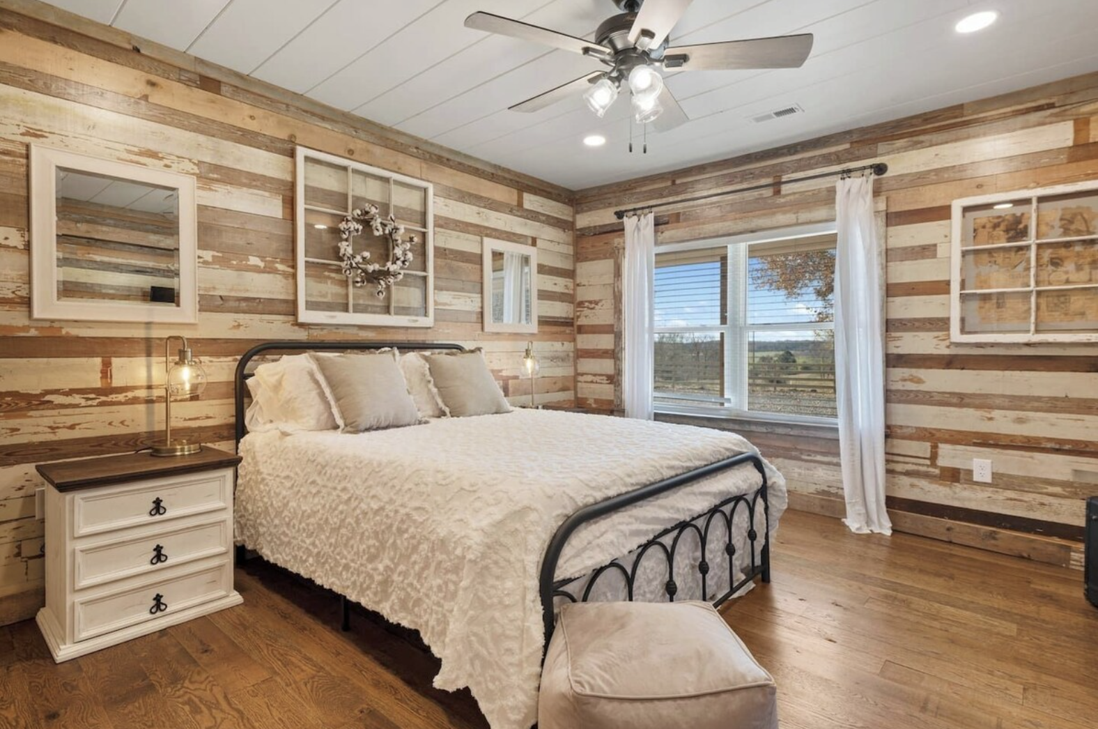 The cooking space retains the farmhouse feel while being fully equipped. Refined kitchen appliances provide all the convenience that modern life has to offer without compromising the hospitality and the warmth which is embodied in the whole house. The dining room is just nearby and can easily accommodate more people and it has windows that bring the farm right inside your home. The meal-prep area is both functional and beautiful and the whole setting is so inviting that you will never want to leave it even for a moment.
