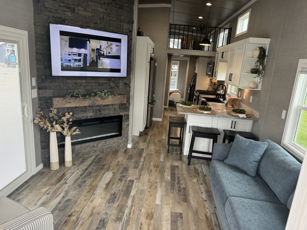 The Elevation’s practicality suits a range of lifestyles with ease. With 400 square feet, it can serve as a year-round home for a small family, the queen bed and sleeper sofa offering sleeping options, the loft providing extra space for kids or guests, and the kitchen appliances supporting daily meals. As a retreat, it becomes a peaceful escape—a couple’s getaway with the main bed, a family gathering with the sofa and loft, or a solo sanctuary with room to spread out. The washer/dryer and fireplace enhance its livability, making it a flexible base for extended stays or short visits, shaped by the needs of those who dwell within.