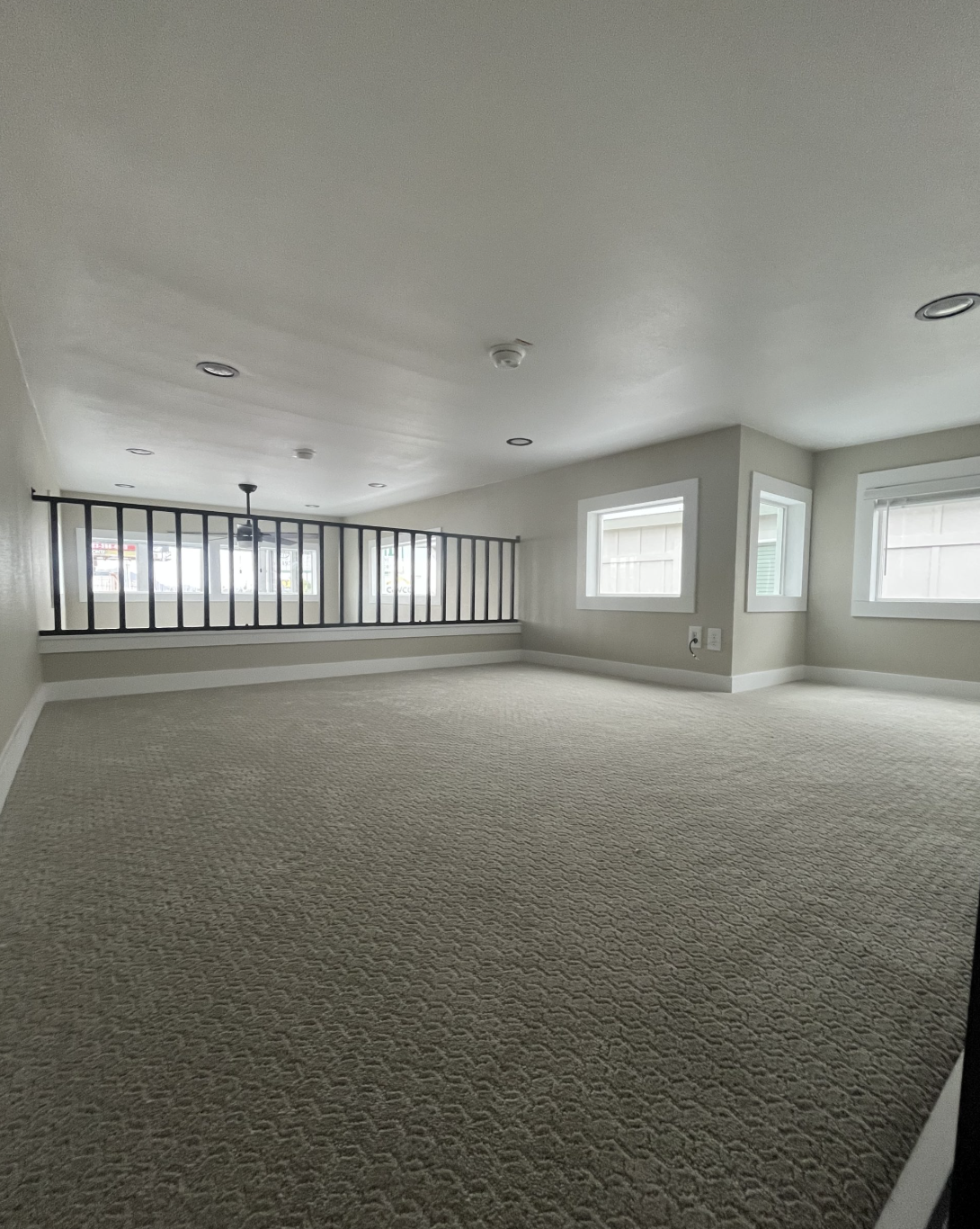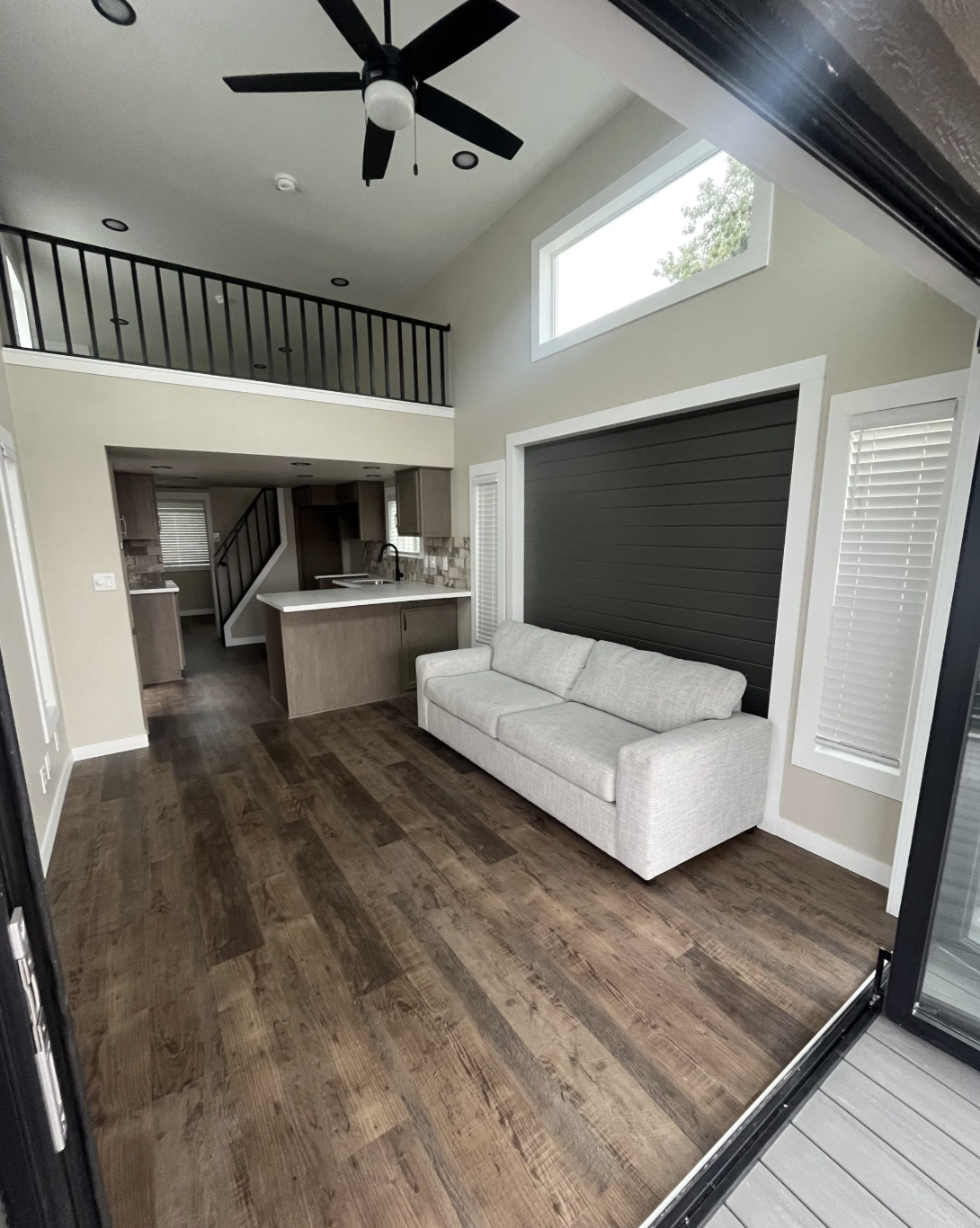 This park model cabin is brought indoors completed, including kitchen and bathroom, so that owners can start enjoying the place the moment they move in. The U-shaped kitchen has laminate countertops, a stainless steel sink, hardwood cabinet doors, and residential-style hardware, which are not only visually pleasing but also make cooking a delight. For the bathroom, you can get either a spacious fiberglass shower or a tub/shower combination, a vanity with laminate countertop, and ample storage. Classic shiplap accent walls, white painted interiors with rounded corners, Congoleum lino flooring, recessed lighting, and faux wood blinds make the living environment bright, inviting, and easy to maintain. A full-width wardrobe with mirrored doors along with an egress bedroom window give storage and safety simultaneously. The center loft with stacked windows gives extra sleeping or storage space while accentuating the open, airy vibe of the main living area.
