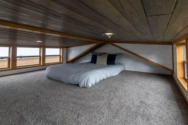 The exterior of the Sunset rolls into view with a sturdy grace, its length of 39 feet and width of 13 feet 8 inches making it a mobile marvel that settles into any spot like it belongs. The closed gable roof, paired with the loft, gives it a classic cabin silhouette, the D-log siding or optional finishes like Hardie Board in colors such as Boothbay Blue or Timber Bark adding a touch of personality. The porch railing, whether PVC in white or metal in black, frames the entrance with a welcoming touch, the composite decking in Campfire or Dark Walnut offering a durable surface for evening chats or morning coffee. Loft not counted in the 396 square feet, but it’s there for extra sleeping or storage, the overall design a beautiful balance of form and function. This setup, from the folks at Saint Tiny Homes, feels like a faithful companion for off-grid dreams or backyard bliss, its beauty in the way it adapts to the landscape, whether parked by a lake or tucked in the woods.