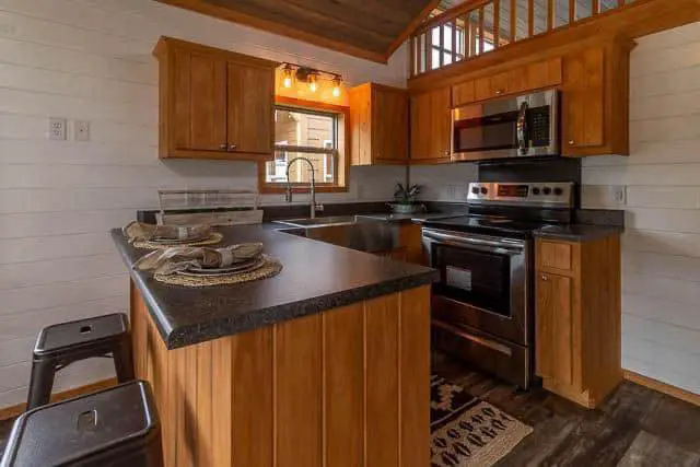 Inside, the 396 square feet unfold with a warmth that feels handcrafted, the R-11 floor, R-13 wall, and R-19 ceiling insulation keeping the space snug through the seasons. The linoleum flooring in Shoreline, Inglewood, or Oak lays down a clean, durable base, the tongue and groove interior walls sealed natural wood adding a rustic charm that’s hard to beat. The kitchen comes alive with hickory cabinets or optional weathered barn wood look, the laminate countertops in Italian White Di Pesco or Labrador Granite offering space for a sink and stove, the 4.8 cu ft smooth top electric range and 18.3 cu ft refrigerator plumbed for ice maker ready for meals. The 1.6 cu ft over-range microwave and stainless steel gooseneck faucet complete the picture, the ample storage making it a joy to cook in a small space. The beauty here is in the efficiency, every inch working together to create a home that feels full without feeling crowded.