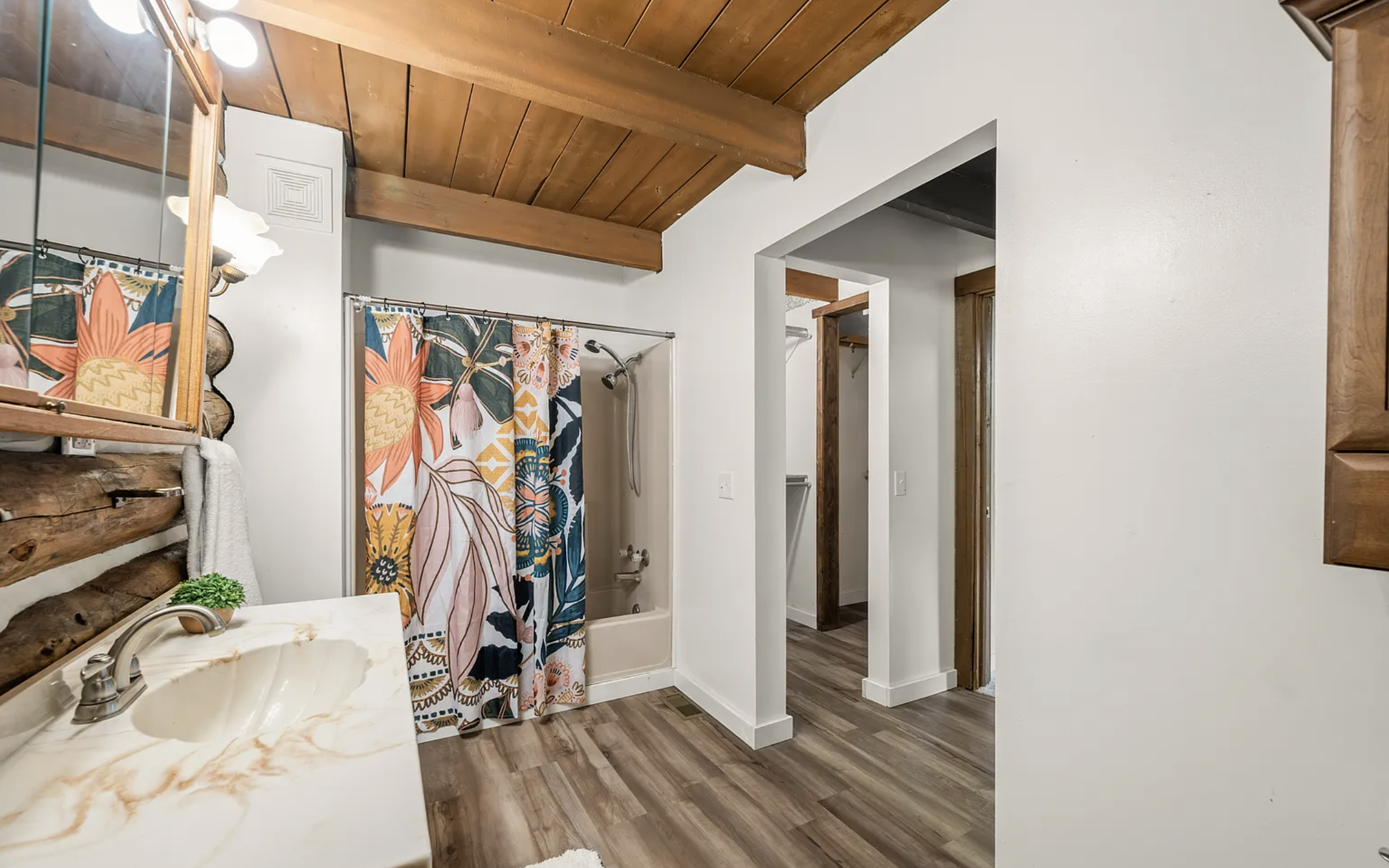 The three bedrooms are designed to provide the occupants with rest and renewal, and each is like a quiet wing of the log cabin’s warm embrace. The main bedroom suite, situated on the ground floor, is a peaceful resort with a king bed close to log walls, double walk-in closets providing ample storage, and a direct link to the bathroom with modern fixtures and tile floors. The second and third bedrooms located upstairs, comprise two queen beds each with space for dressers, and the slanted ceiling giving the room a cozy treehouse-like feel which is perfect for guests or children who are enamored with the charm of a snug hideaway.