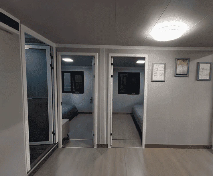This kitchen is designed to be energy efficient with the inclusion of a small refrigerator and stove while the counters provide both the food preparation and dining services. Compact, complete, and well-thought-out is the bathroom which features a toilet, a washbasin, and a shower, all of which are pre-plumbed and ready for use with the tiled areas being spotless and of the contemporary style. The two bedrooms are small and intimate, and each one will be able to fit a double-sized bed or a bunk arrangement, and the space will be sufficient for a nightstand or a small desk, so that the rooms can be used by couples, small families, or for guest accommodation. They are uncompleted walls which give the user the liberality to paint, panel, or shiplap as per their own creative ideas and at the same time there is excellent insulation to guarantee the home’s warmth and silence in all seasons.