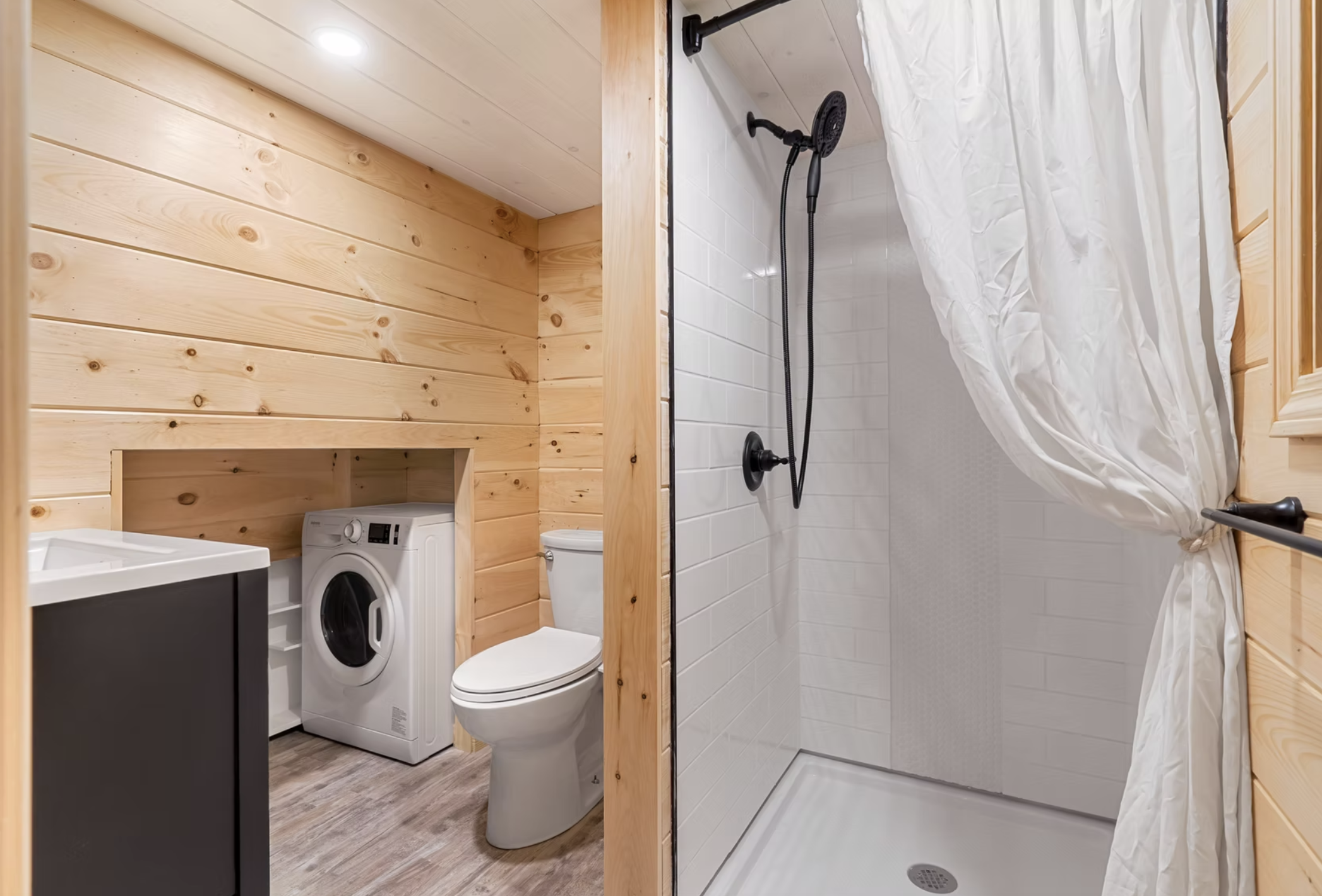 This cabin interior is ready but can be delivered unfurnished or as a shell depending on the selected price option. The light and airy interior boasts an open floor plan that efficiently uses every inch of space. The standing loft is up to provide extra sleeping or storage, the tiled shower, and laundry area promise the luxury of everyday convenience. This interior could be a blank canvas on which the owners could furnish and decorate to express their personality and lifestyle.