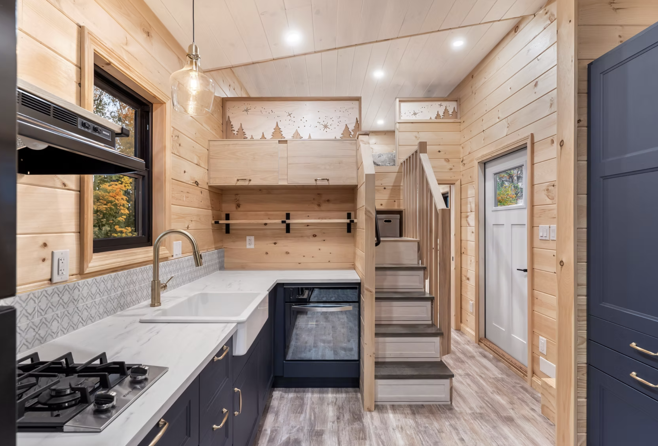 Seasonal adaptability turns The White Pine cabin into a really good choice for all four seasons living. In spring and summer, the openings on the windows and design of the cabin make use of natural light and fresh air, thus creating a bright and airy atmosphere. The soft light wood shades of the interior and the custom forested elements visually reflect fall’s changing colors.