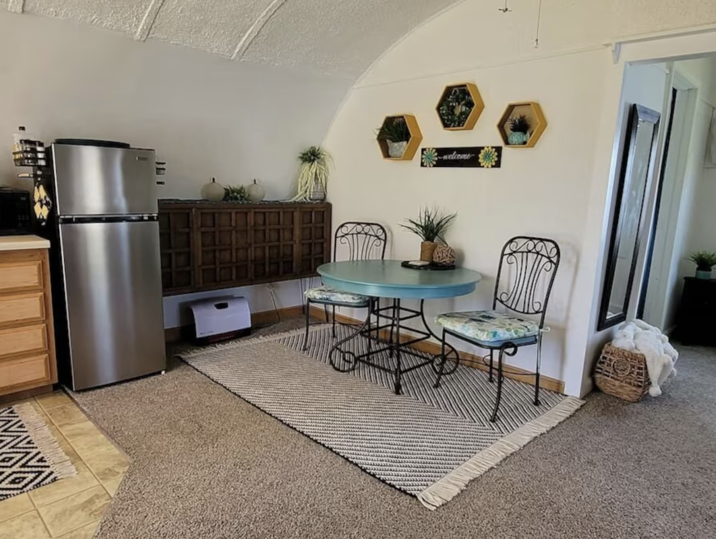 The Quonset hut retreat in Paw Paw, Michigan, is a stunning reworked mid-century architectural piece that has been converted into a cozy romantic escape that still feels new as well as nostalgic, providing 620 square feet of intimate living space with one bedroom, one bathroom, and the ability to accommodate three people. This unique Quonset hut retreat merges the iconic curved steel structure with the comforts of the modern world such as a full kitchen, air conditioning, washer and dryer, and a charming outdoor patio, thus making a perfect combination of rustic charm and contemporary convenience.