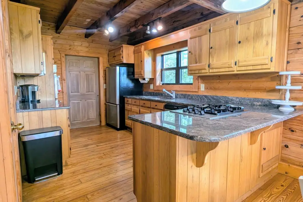 The exterior of the log cabin reveals a timeless grace, its handcrafted logs rising from the earth with a texture that echoes the forested hills around it. The front porch, a classic feature, stretches out like a welcoming arm, offering a spot to sit with a book or watch the morning mist lift from the valley. The 37.66 acres of gently sloping land provide a private canvas, dotted with trees and open meadows that invite exploration on foot or by thought alone. The cabin’s placement on the property feels deliberate, positioned to catch the long-range views of the Dan River Gorge and Primland Resort, the distant peaks a constant companion through the windows. This integration with the land adds to the home’s beauty, making it a place where the mountains seem to rise with the roofline, the wood’s natural tones blending seamlessly with the earth.