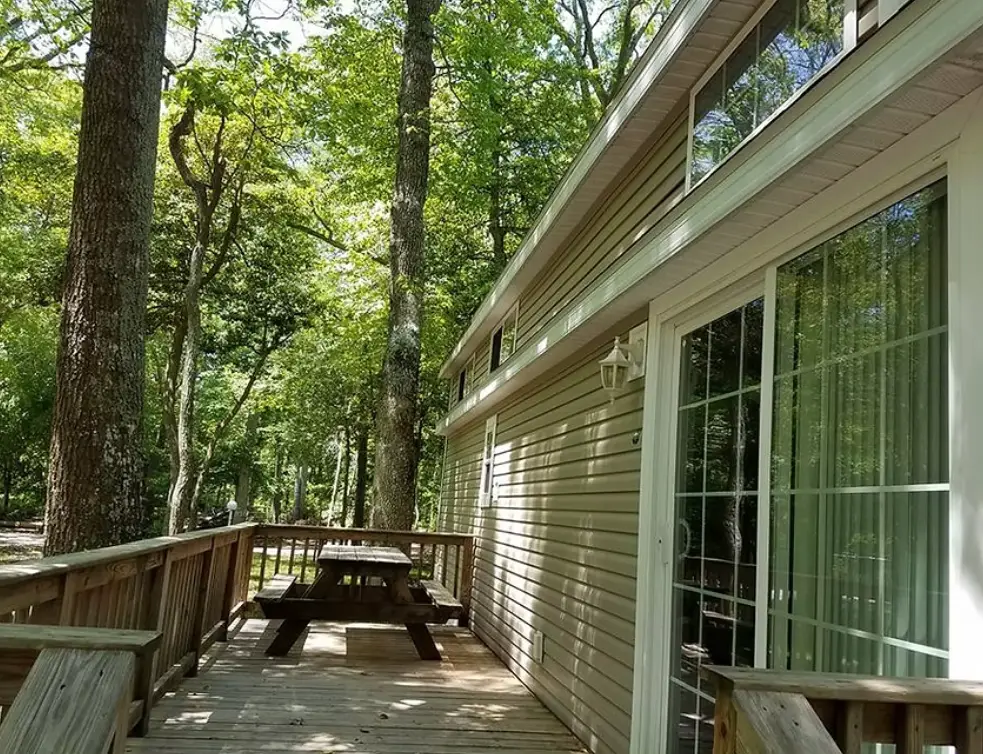 The pet-friendly unit, with its queen bed and two sleeper sofas, offers a different yet equally captivating layout, sleeping five without the loft, its design tailored for those traveling with a furry companion. The deck outside becomes an extension of this beauty, a place to sit with a dog at your side, the picnic table and grill framing a scene of outdoor living. The split rail fencing adds a rustic boundary, the wooded surroundings enhancing the sense of seclusion, making every glance a connection to nature’s quiet splendor.