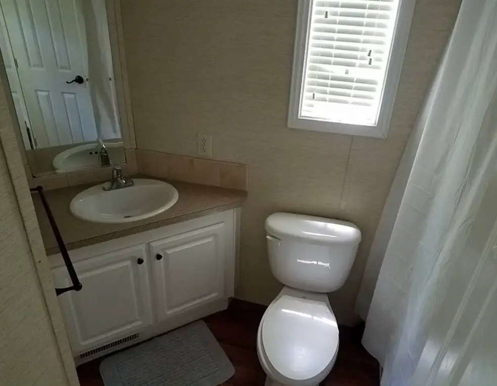 The kitchen shines as a practical yet elegant centerpiece, its full-sized refrigerator/freezer humming softly as it holds the day’s provisions, perhaps fresh catch from the lake. The oven and stovetop, complemented by a microwave and toaster, make cooking a joy, the cookware and dishware neatly arranged for meals that fill the air with warmth. The coffee/tea maker stands ready to brew a morning ritual, its steam rising like a gentle fog, the countertops holding a simple beauty in their utility. This space feels alive with the scent of pine from the walls mingling with the aroma of food, a place where the park model’s charm deepens with every shared moment.