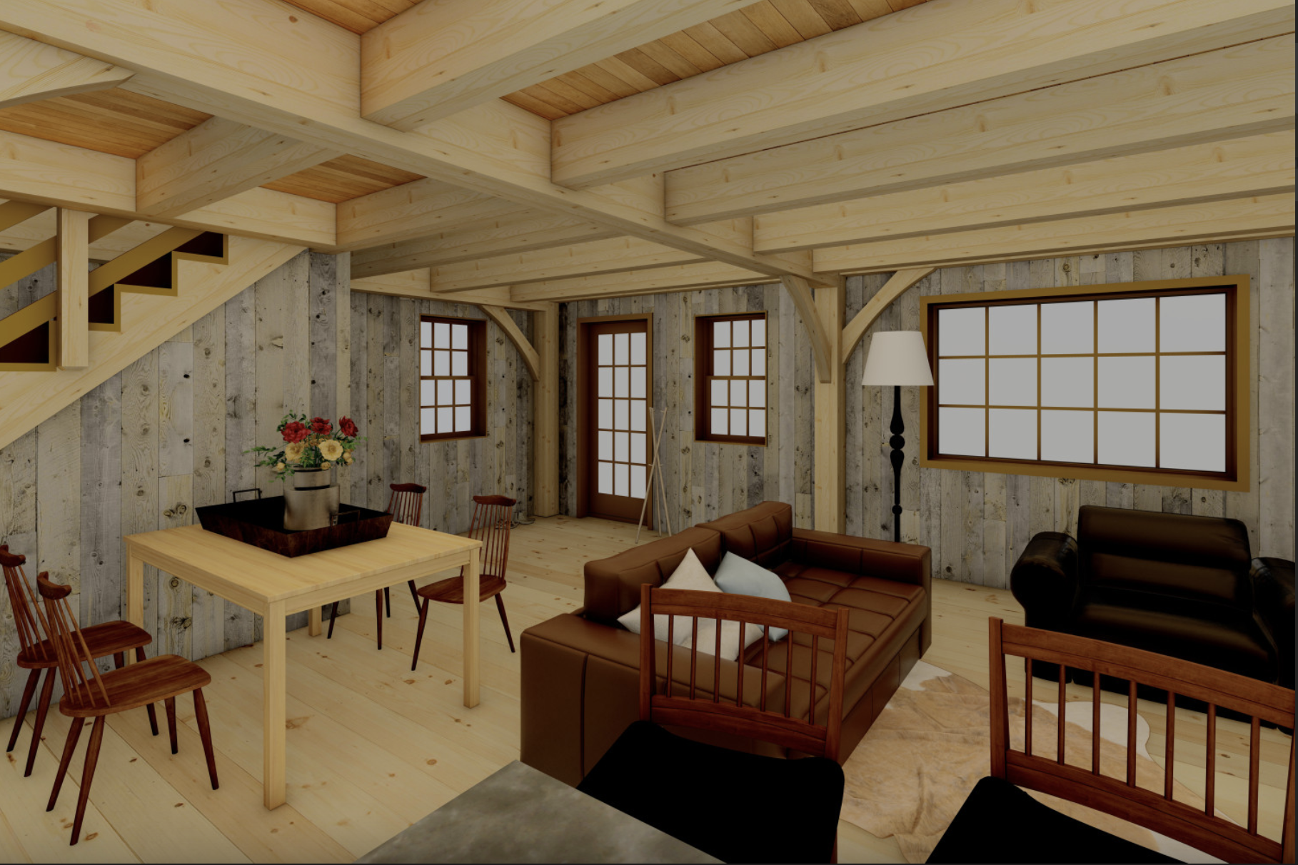 The Allagash cabin kit uses authentic mortise and tenon joinery, which are then secured with hardwood oak pegs. This results in a strong and beautiful frame with no visible fasteners. The heavy Eastern White Pine timbers are smoothly planed. The arched braces and the substantial beams add architectural interest as well as provide the structure with the necessary strength.