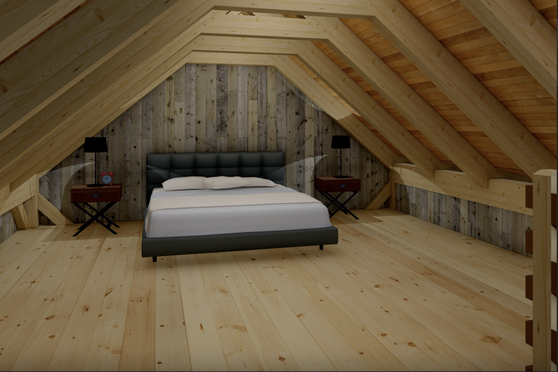 And the second floor includes a spacious loft bedroom, that has enough space and filled with classic cabin’s charm.