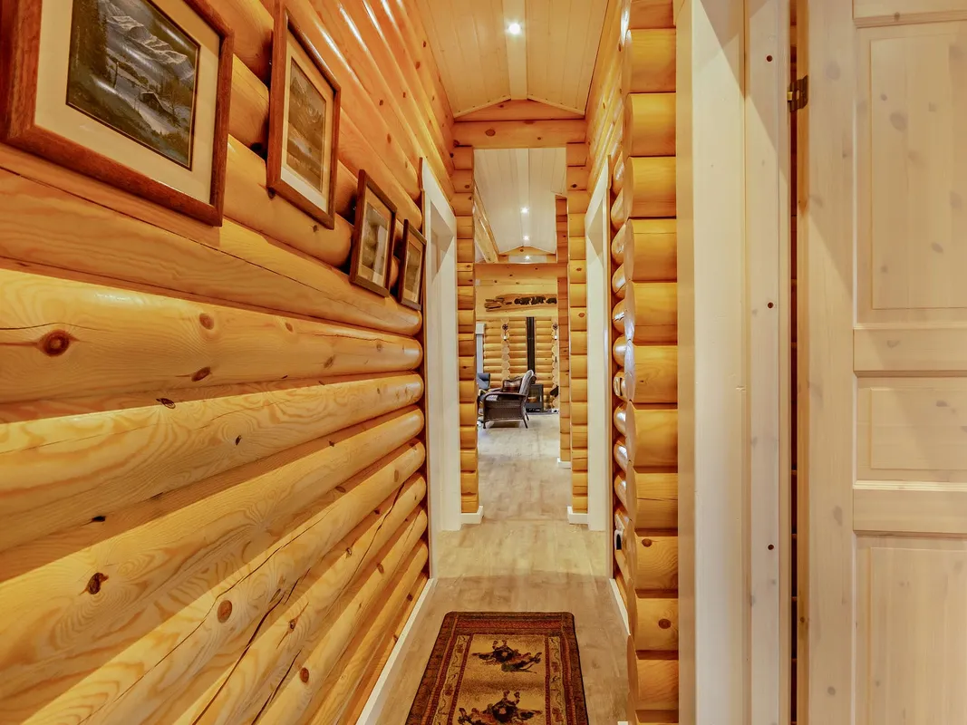 The cabin’s exterior stands out with its sturdy log construction, a nod to its Finnish roots, the wood weathered just enough to feel authentic yet inviting. The spacious veranda wraps around like a generous hug, its comfortable seating a perfect perch to watch the countryside unfold—fields stretching toward the horizon, trees swaying in the breeze. The six-person hot tub, nestled nearby, adds a touch of luxury, its warm water a soothing contrast to the cool air, especially on crisp evenings. The parking for five cars nearby speaks to the practicality of hosting a small gathering, the land around it a private oasis free from the usual bustle. This outdoor space, with its natural backdrop, turns the retreat into a place where time seems to slow, the views a constant reminder of the peace found just beyond the door.