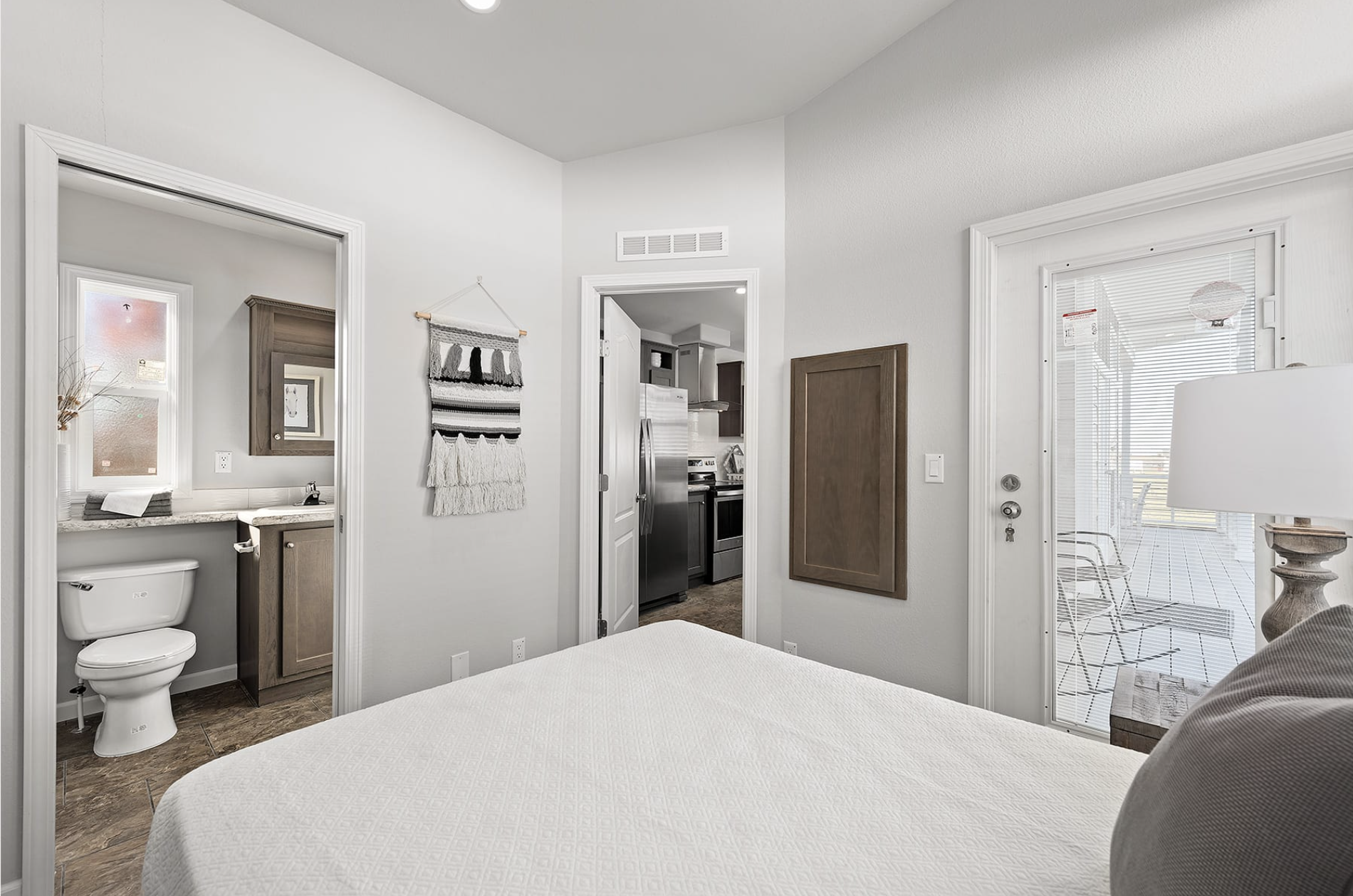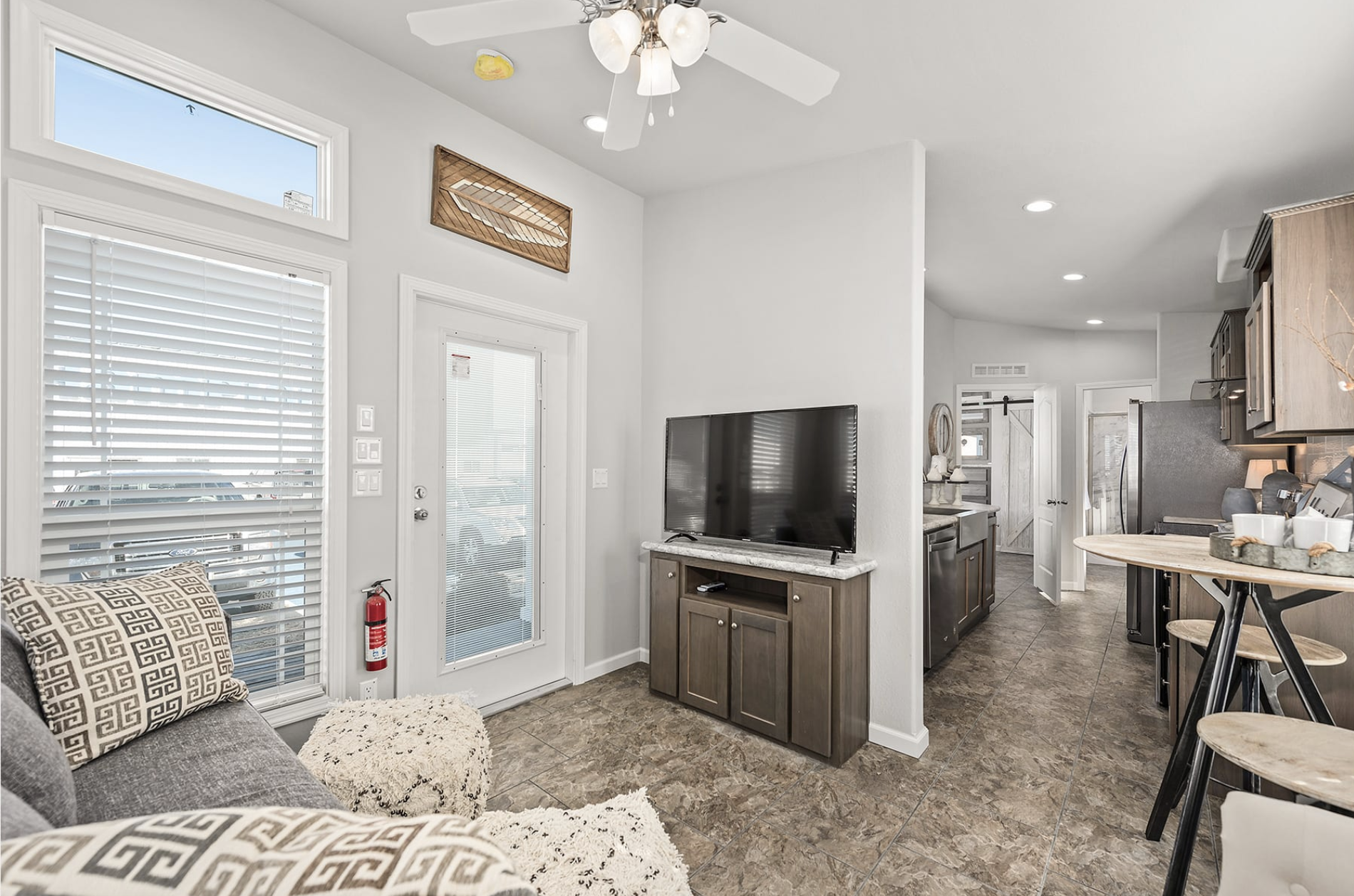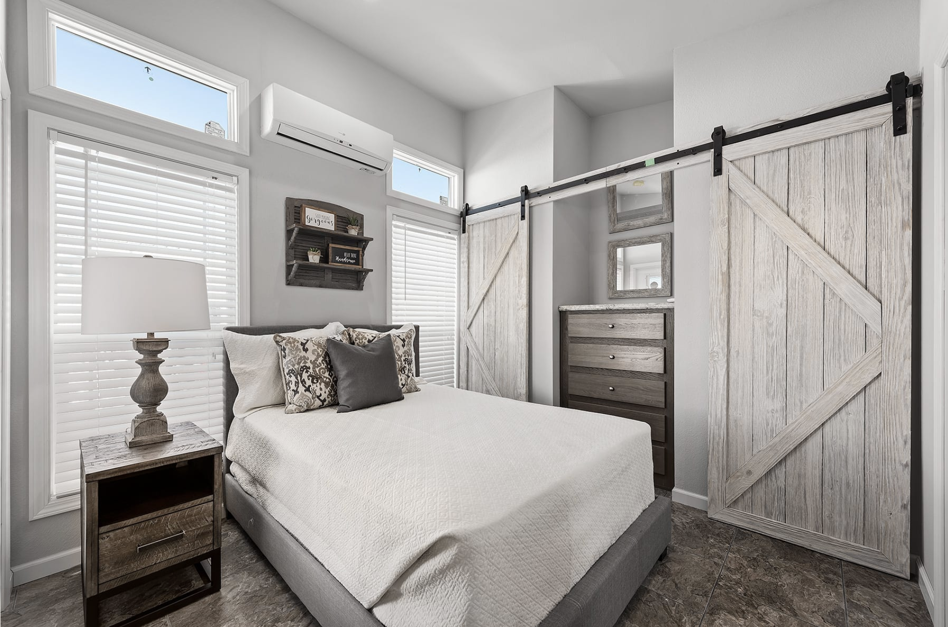 First of all, the Athens 520 park model cabin’s bedroom is what really makes it unique. Instead of cramped and insufficient sleeping quarters most park models have, Champion cleverly came up with a real king-size bedroom suite. The large retreat easily holds a king bed with the space for nightstands and dressers while a sliding barn door opens to a well-equipped bathroom with residential-height vanity, extra-large shower, and plenty of storage. It is because of the two windows that natural light comes in and morning routines are more like pampering than being obligatory.