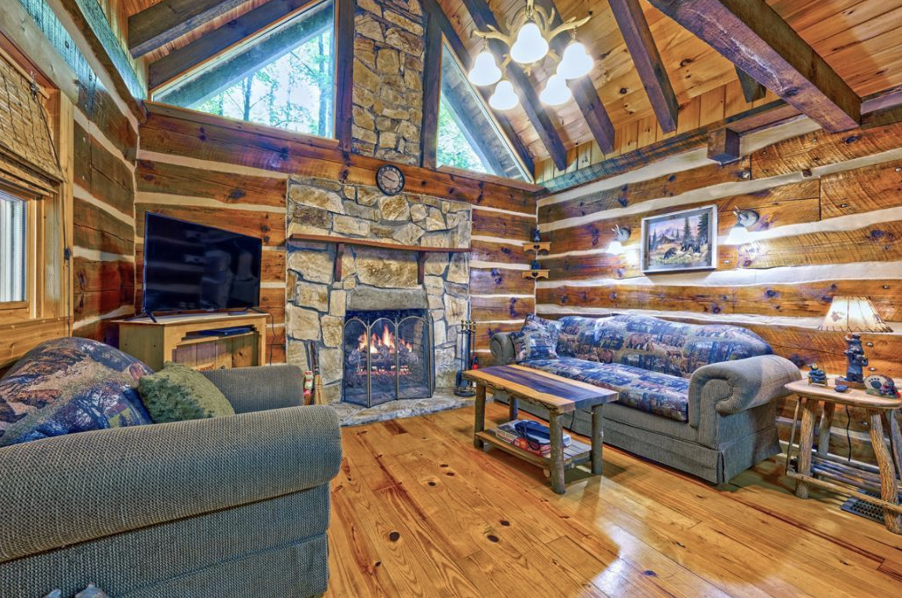 This cabin nestles in Murphy, North Carolina which means you have at your disposal the lakes and forests that a short drive away, the hiking trails, fishing spots what’s more, the cabin is such a beautiful home base for your adventures and a perfect place to come back to. This is a cabin where the interior’s rustic luxury log walls, wood stove, warm lighting meets the exterior’s natural embrace, a space that’s as beautiful for its solitude as it is for its shared joy, where the creek views through the windows remind you that you’re not just living in the cabin you’re living with the land.