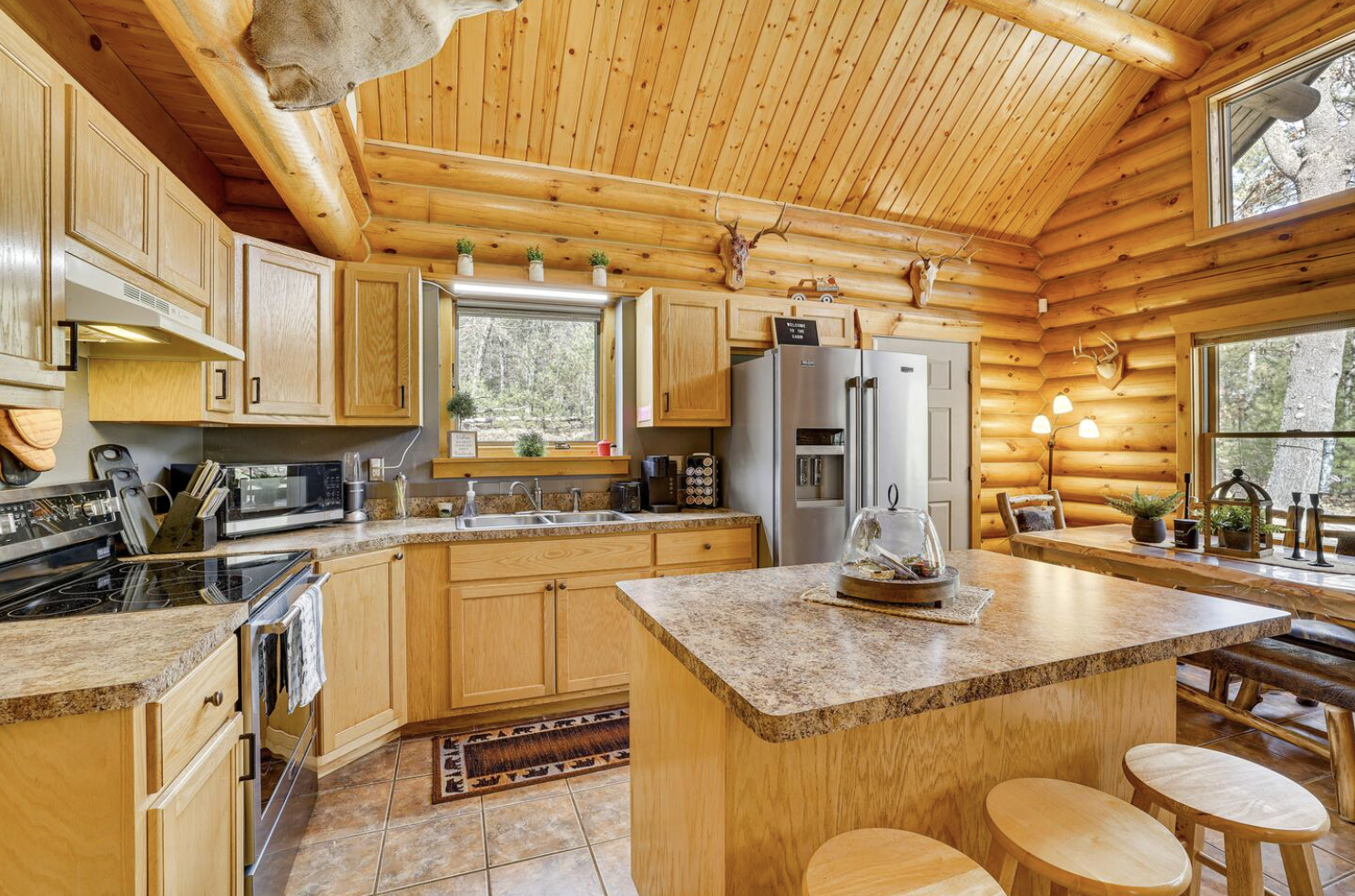 The cabin’s exterior is a wonderful attraction with real rustic beauty. The sun gently reflects off the warm log siding, and the front porch is a large, covered, area that is perfect for sitting in rocking chairs with a cup of coffee while the morning sun comes through the trees.