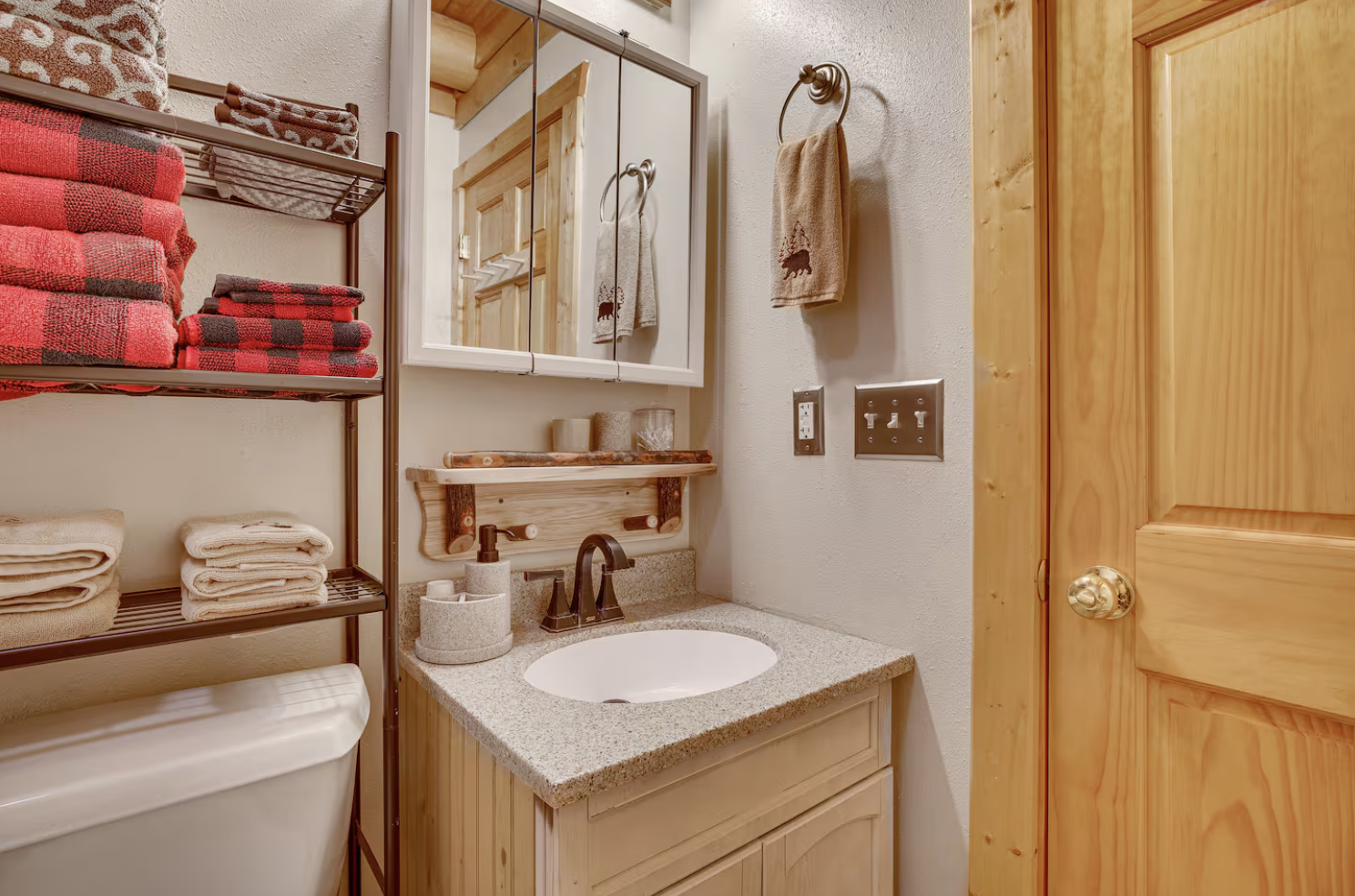 The bathroom is functional and modern. It has been remodeled with clean sanitary ware and the water pressure that will make wash up refreshing and easy. The design of the space is simple but still, it has all the necessary facilities and the convenient gadgets of the present will be found as well, besides, the bathroom being a part of the rustic environment. The bathroom increases the value of the cabin as a comfortable and self sufficient retreat.