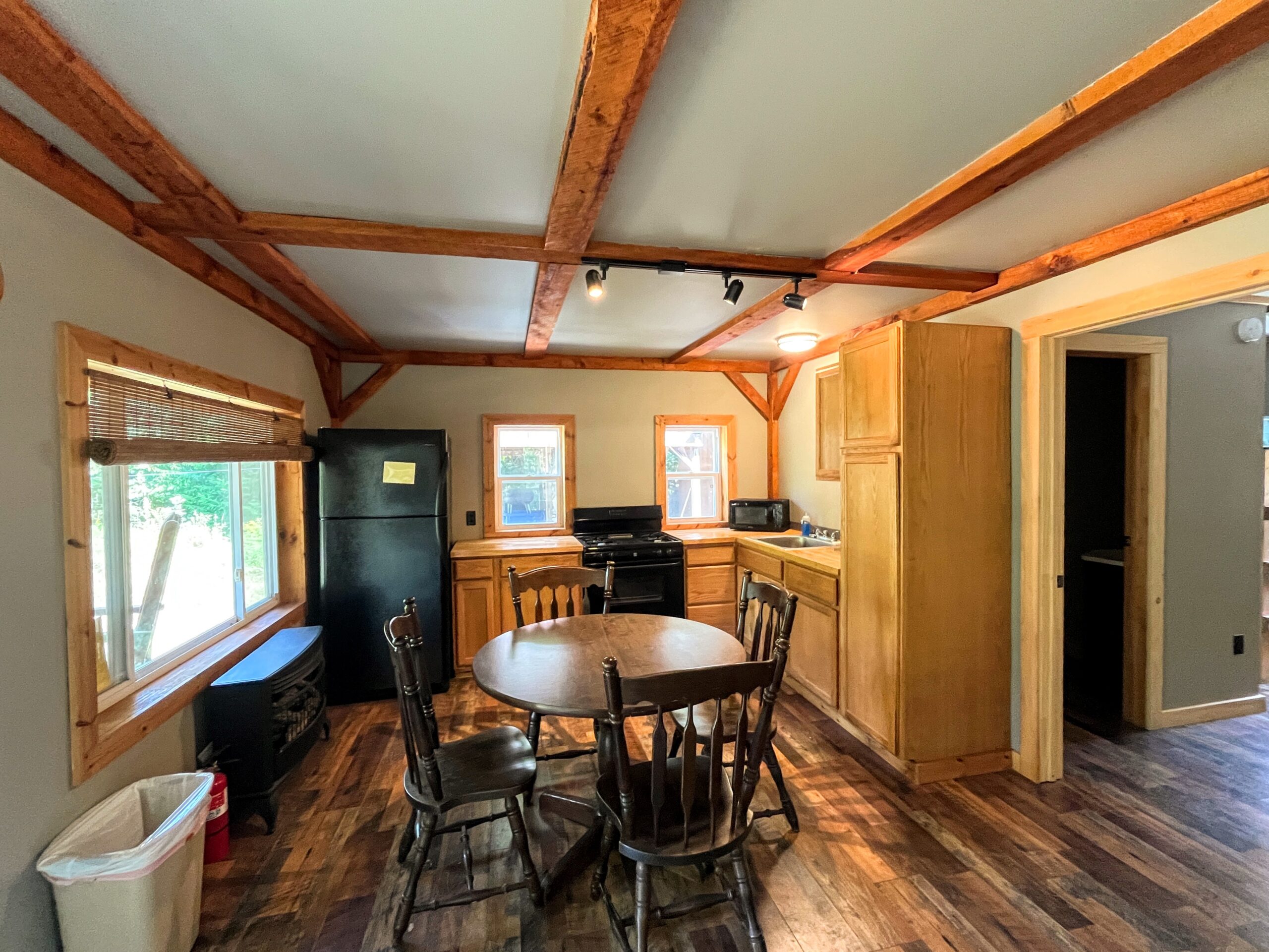 | Interior | Vaulted pine ceilings, stone fireplace |