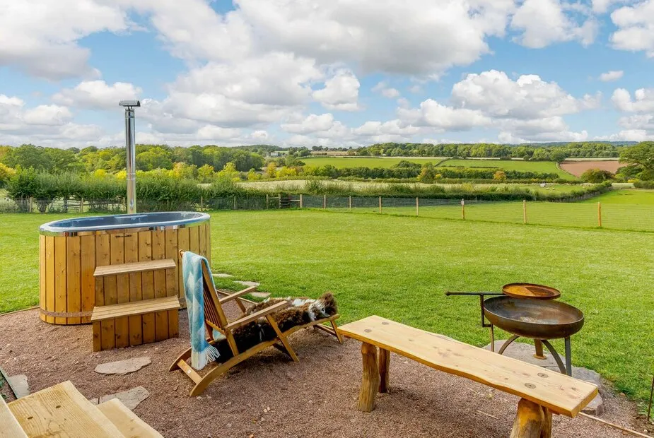 The exterior of the cabin rises with a sturdy yet elegant charm, its log construction harmonizing with the rolling Herefordshire countryside. The decked terrace, complete with al fresco dining furniture and a BBQ fire pit, extends the living space outdoors, offering a spot to savor the surrounding views—fields stretching to the horizon, trees swaying in the breeze. The wood-fired hot tub adds a layer of indulgence, its warm waters a soothing contrast to the cool evenings, the steam rising like a soft veil against the stars. The private parking ensures convenience, the property’s peaceful setting a buffer from the outside world. This outdoor harmony, with its rustic luxury, turns the cabin into a living extension of the land, a retreat where nature feels like a close companion.