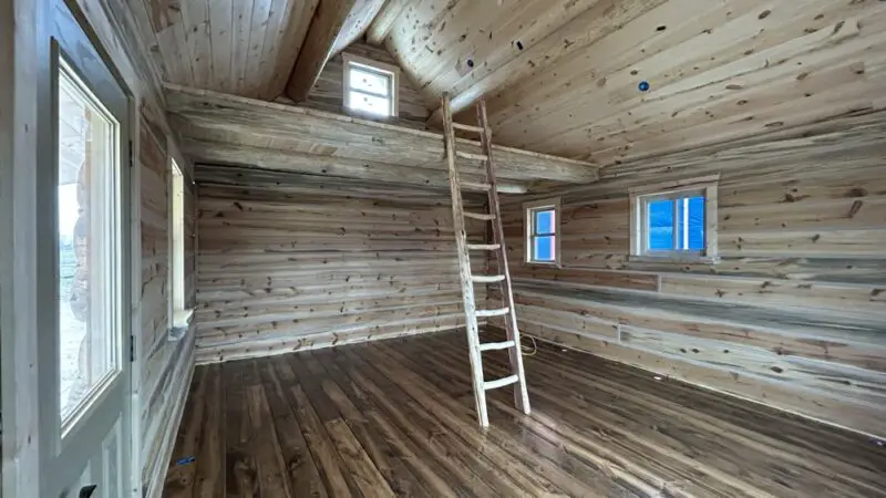 The cabin’s exterior greets you with a rugged elegance, its panels of sturdy wood promising durability as they’re assembled on-site. The half-loft, perched above the main space, adds a cozy nook, while the expansive 8’ x 20’ porch stretches out like an invitation to linger, framing views of rolling hills or dense forests. The design, built to pull smoothly behind a one-ton dually, speaks to its portability, a feature that opens doors to remote settings—think a mountain ridge or a quiet country meadow. The unfinished interior, with its raw wood walls and ceiling, carries a natural beauty, the 7’ hickory base and wall adding warmth that ages gracefully, needing only your touch to complete its story.