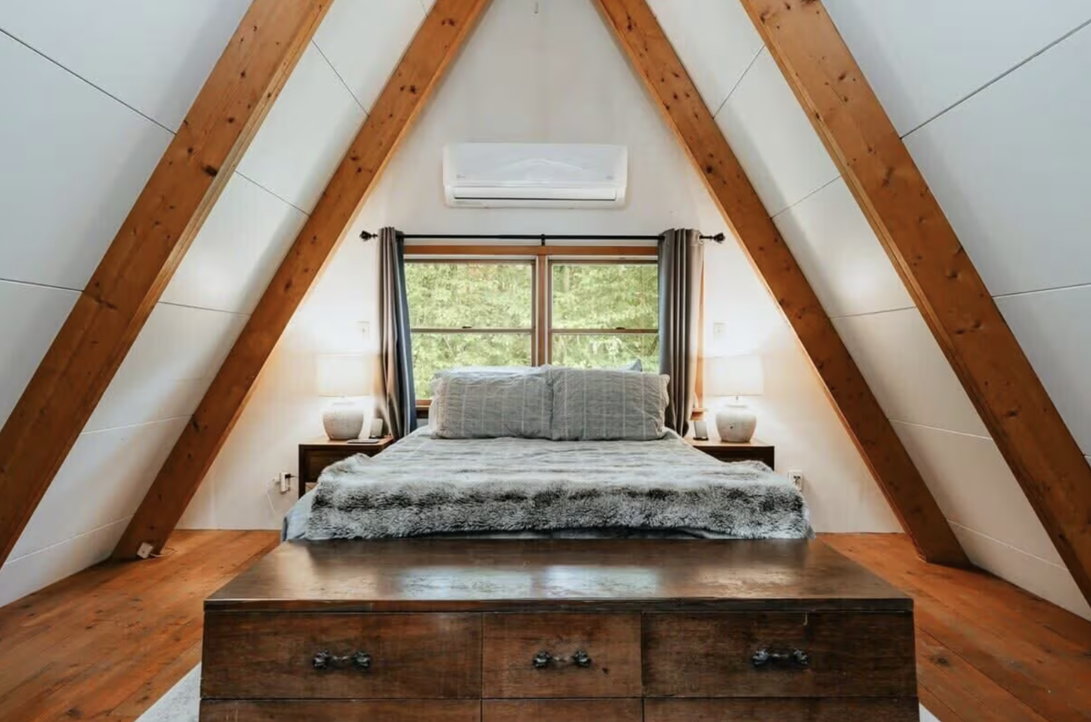 The Cabin with its classic A-frame aspect can still hold a candle to authentic, exterior charm. The side of the cabin offers a generous verandah covered that can be used as an outside living space the whole year round, especially if a hot drink in-hand and watching the river for a long time is one’s idea of a good time.