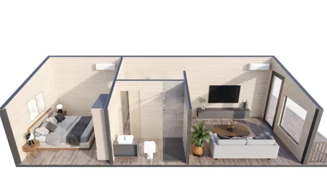 Living in the Prefab Modular Duplex Cabin fosters a connection to community and self. The 792 square feet, with its two units, offer room for quiet moments or small gatherings, the shared structure providing a sense of togetherness. As a retreat, it provides a pause from daily life, the light casting warmth on a workspace or reading spot, framed by the sturdy shell. This suits seasonal camping, year-round residency, or temporary projects, the customizable layout inviting owners to mold it to their needs across the seasons. The presence of separate entrances and living areas suggests a foundation for extended stays, adaptable to evolving requirements.