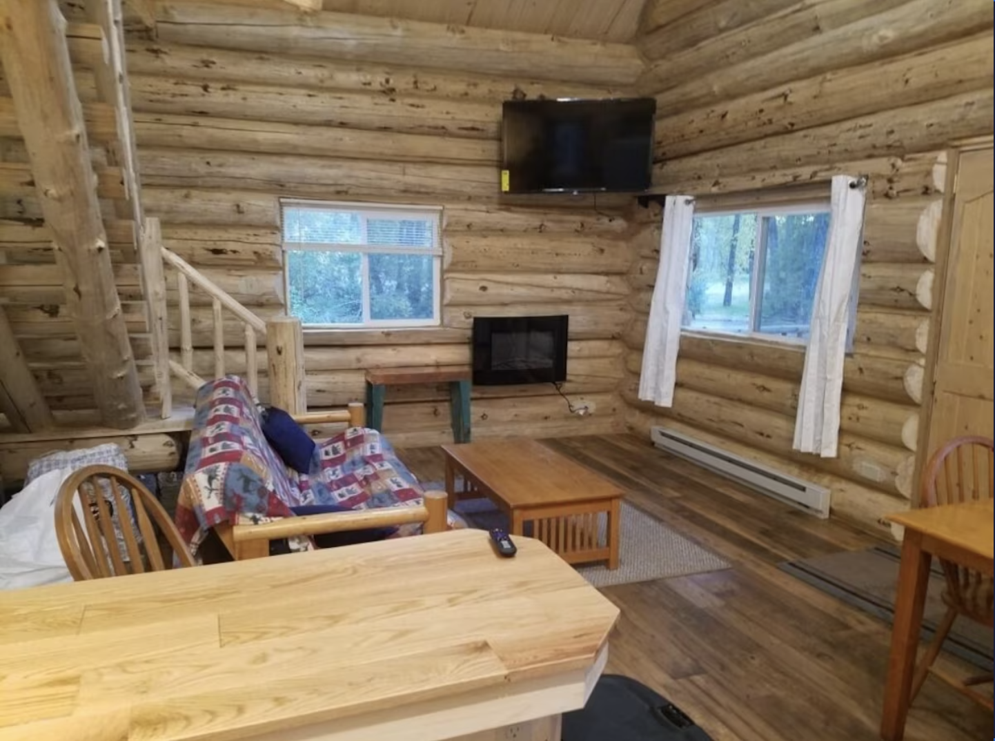Once you are in, you can see the beauty of the cabin’s inside and it even more spacious due to the open plan layout of the 1000 square-foot area. The living room which is the main part of the whole area is dominated by the stone fireplace which takes a whole wall and the firebox is broad enough for putting boots and thus, the flames throw the shadows up and down the walls which are made of logs.