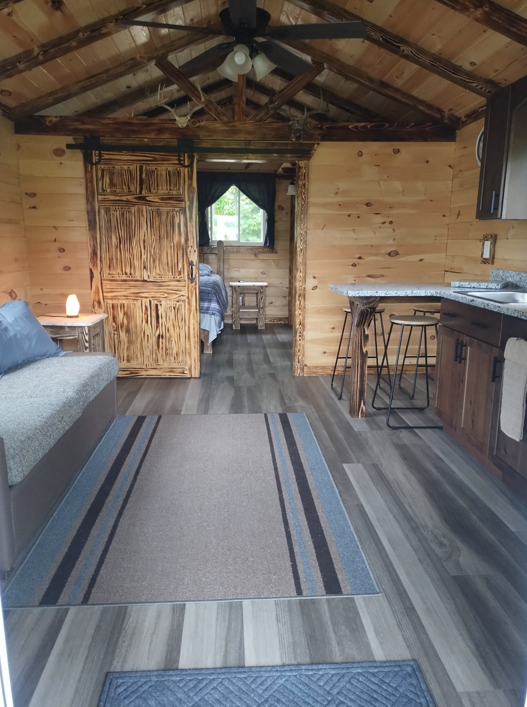 The cabin’s facade is a testimony of timeless Amish-style construction with thick pine logs that lend it a robust and high-quality look. A covered porch not only warms up the house visually but also gives the outdoor living area a comfy and intimate environment.