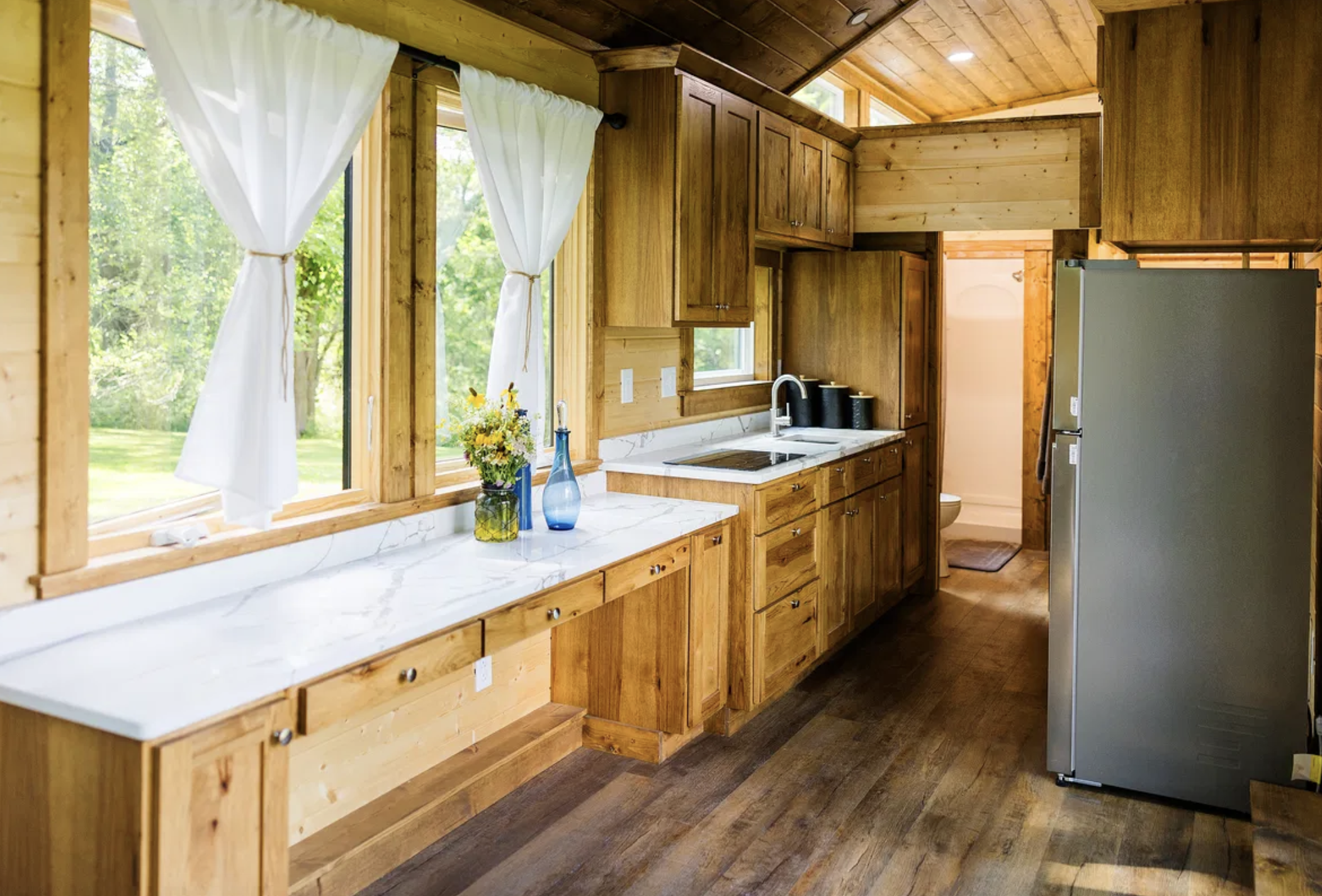 Just in case you are interested in it, it is an elegant Amish-built tiny home on wheels listed for sale on Tiny House Listings. In case it is your interest to get the detailed information and photos, current price, and arrange viewing or purchase, you should visit the listing: Tiny House Listings