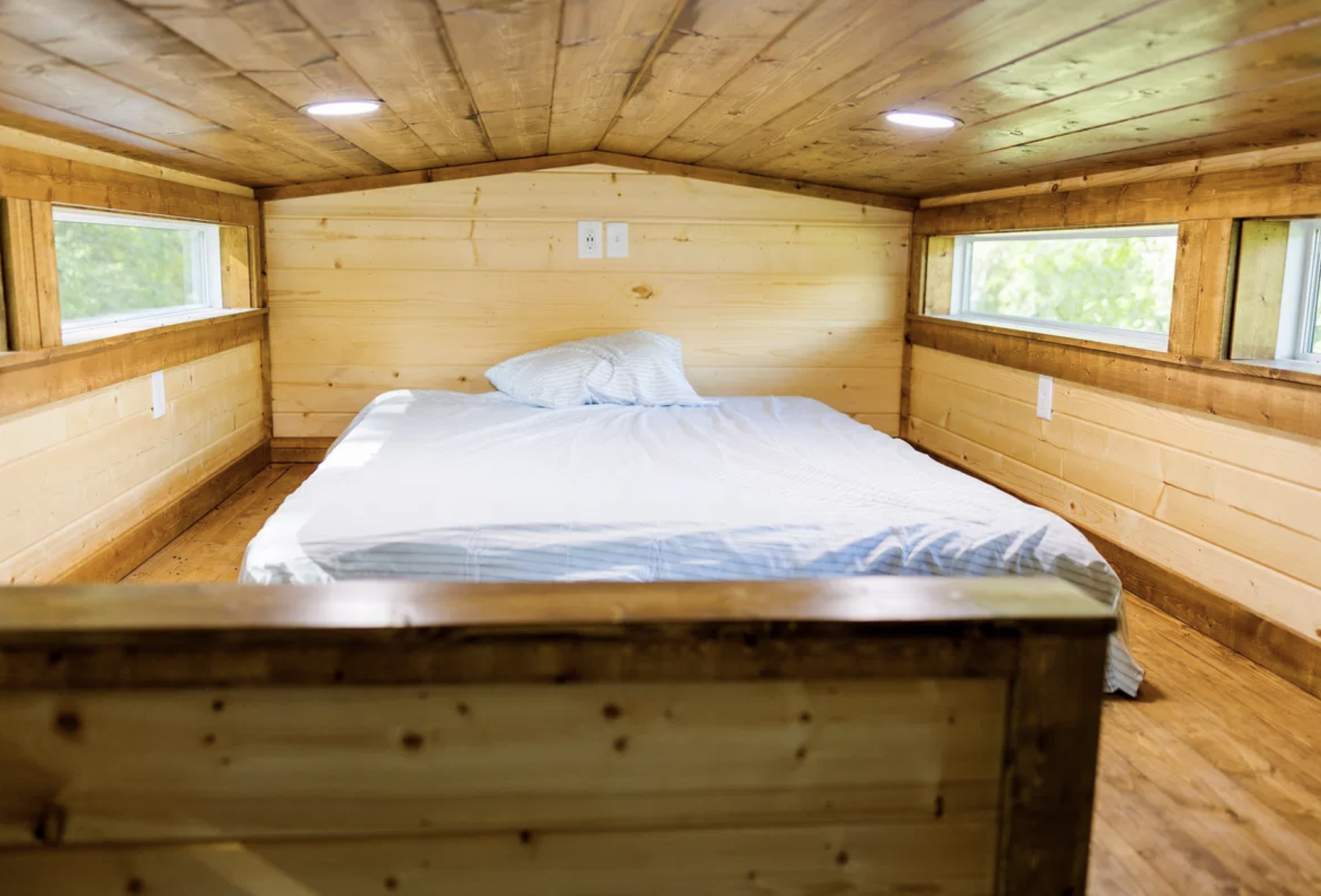 The loft bedroom is under the loft roofline and can be used when you are in need of a bed. It feels tucked away, one of the reasons is that it is reached by stairs, but it is still open to ospirit of the whole tiny home.