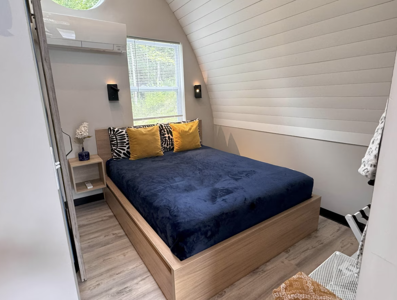 The bedroom is a serene retreat, with a plush bed nestled in a peaceful space that encourages deep, restorative sleep. The room feels intimate and calm, with natural light and quiet that make it easy to relax completely. The cabin’s thoughtful design ensures the bedroom serves as a true sanctuary, perfect for couples seeking restful nights under the starry mountain sky.