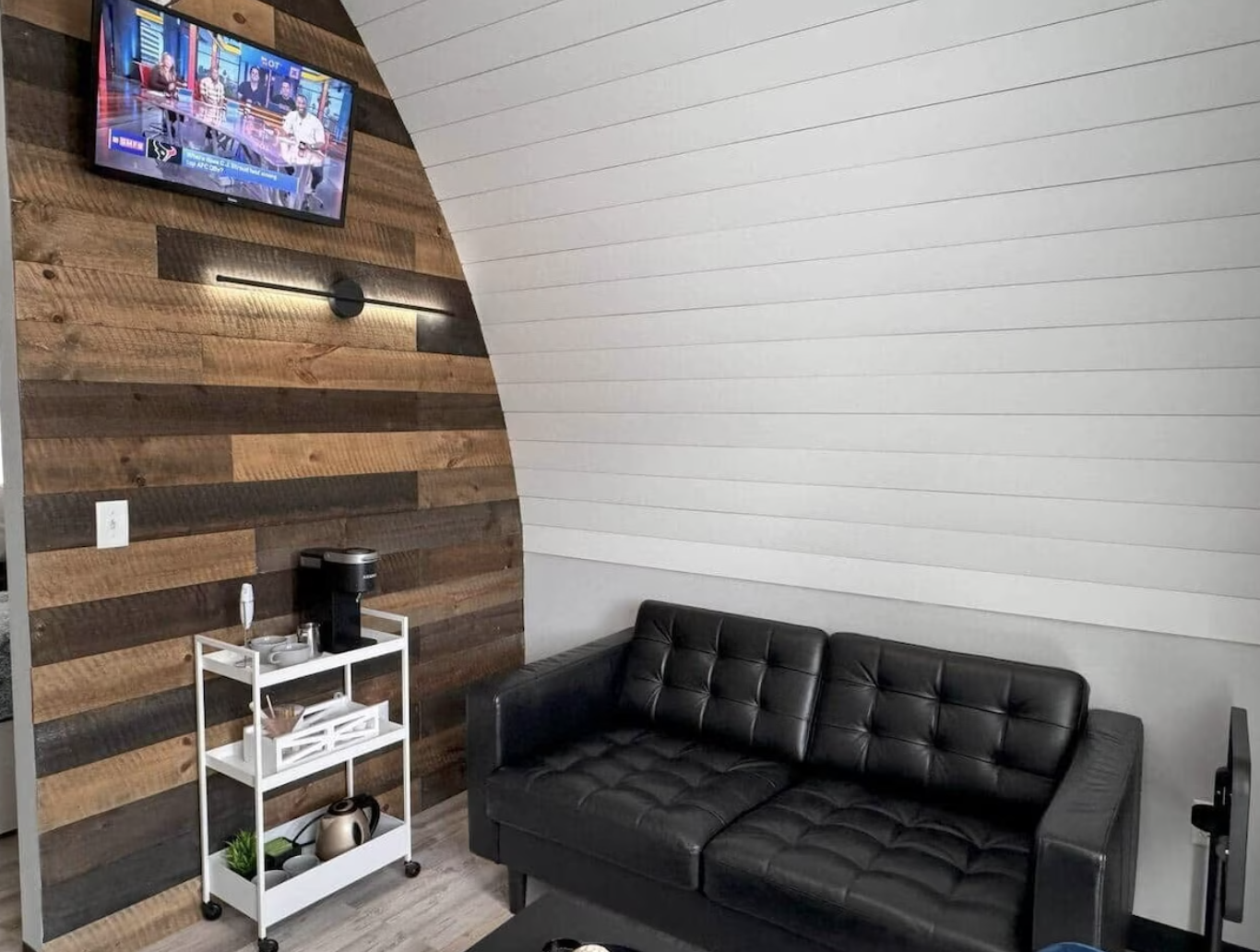 Step inside and the cabin immediately envelops guests in cozy warmth. The open living area features comfortable seating arranged for conversation or quiet evenings, with natural light pouring through the windows to highlight the inviting rustic decor. The space is thoughtfully designed for relaxation—perfect for unwinding after a day exploring nearby trails or simply enjoying the peace of the mountains. The cabin’s arched ceiling adds a unique architectural touch, creating an airy feel that makes the interior feel spacious and welcoming.
