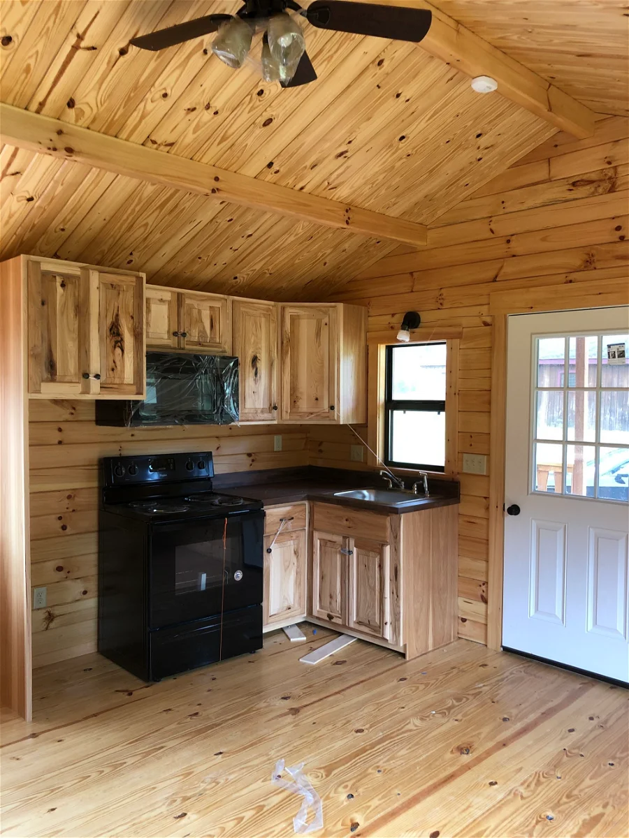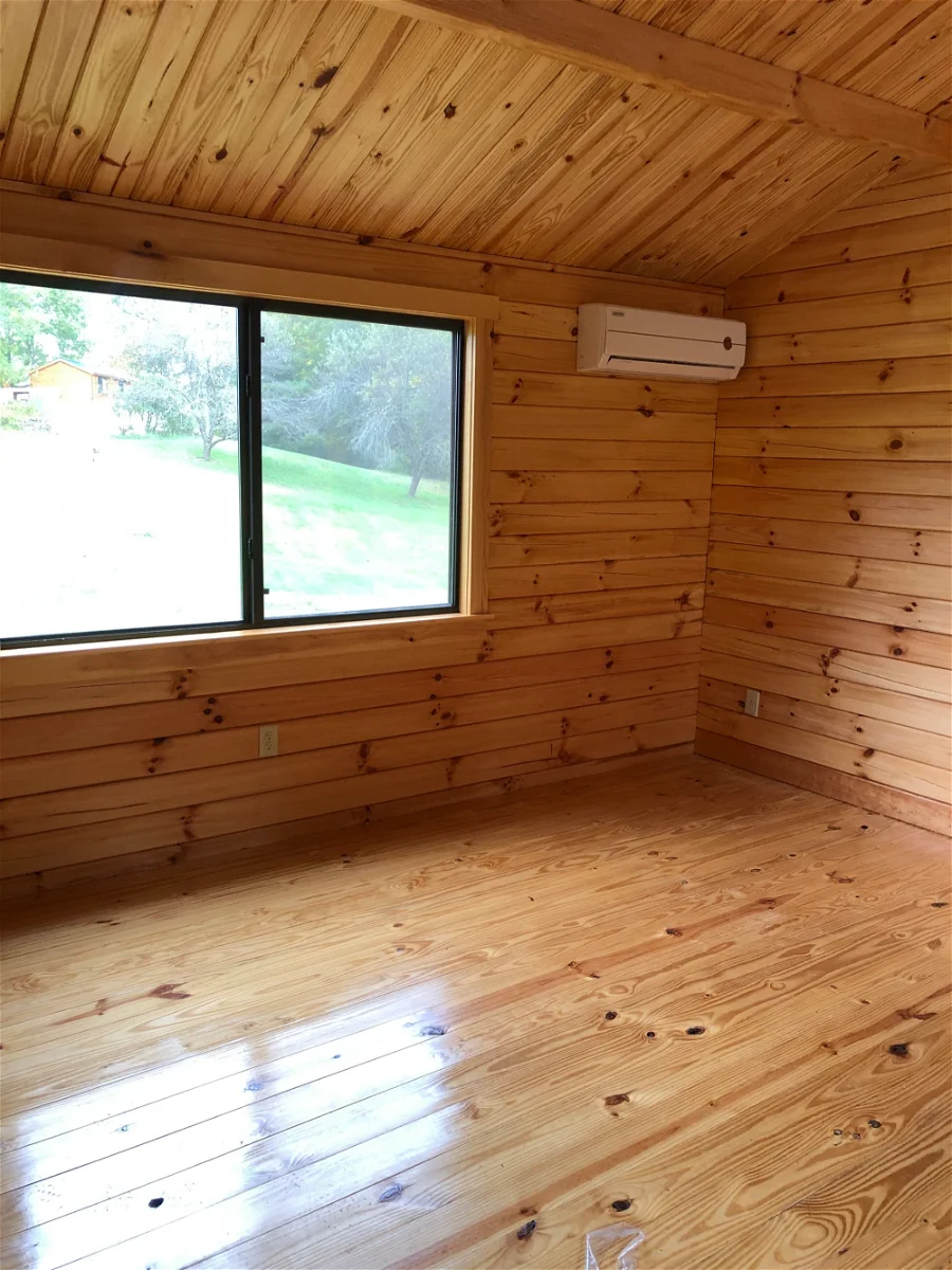 With only 400 square feet, this log cabin tiny home is a genuine one with a real living area. The generous width of 15 feet (wider than most tiny homes on wheels) makes it possible to have a true open-concept great room, a bedroom, and a full bathroom without feeling tight at all. The high ceilings and the well-placed windows allow natural light to flood the interior while the unfinished state gives you complete freedom of design.