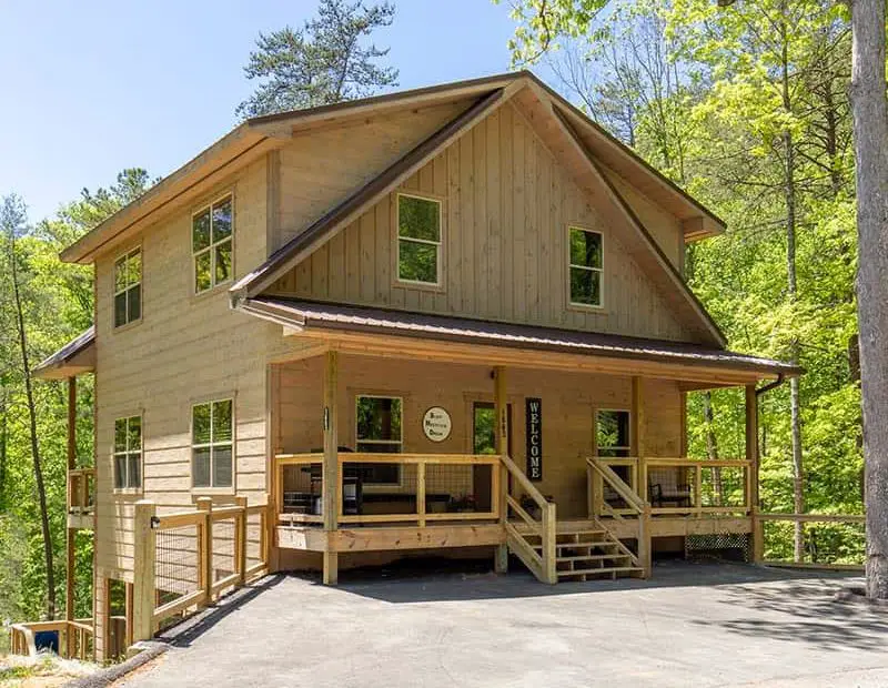 The exterior of Bluff Mountain Dream stands as a quiet sentinel in the rolling hills… Cabin Retreat with Indoor Pool & Movie Theatre Experience