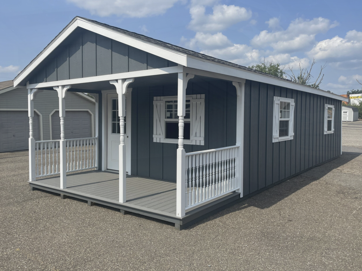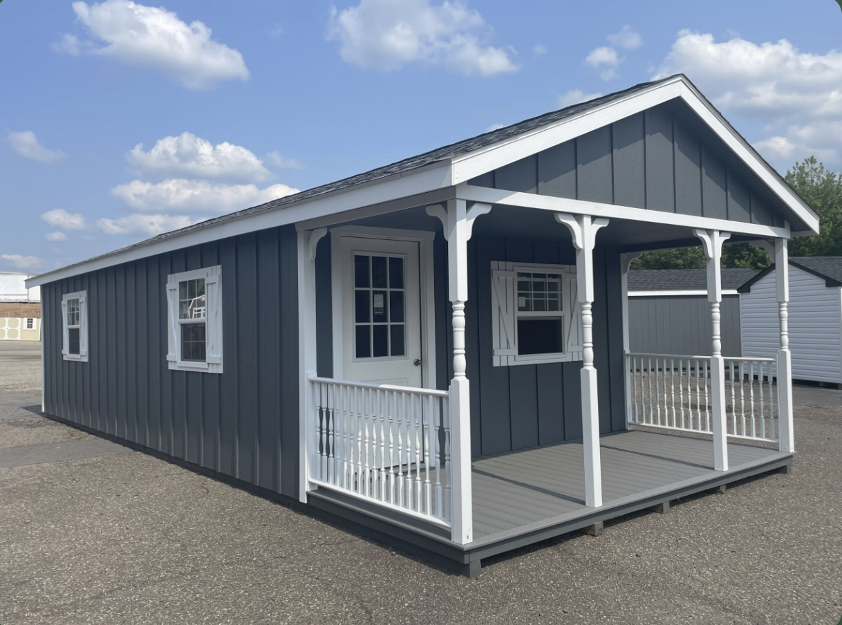 The outside of the Peak White Deer Cabin is a beautiful work of art made by a master craftsman. The 50-year LP Smartsiding, painted in a trendy dark gray, is very durable and demand very little time for maintenance. It also resists aging and weathering very well while maintaining a sleek and modern look. White trim and shutters bring in a fresh brightness and add a touch of elegance and refinement to the cabin and reflect classic Americana. The lifetime Timberline shingles in pewter gray, installed over felt paper and a 3-foot ice and water shield, will make the roof last longer under the most severe weather conditions while still keeping its simple beauty. A 6×14-foot porch with a composite decking and wooden spindle railings is there to extend the cabin and provide a covered outdoor space that can be used for relaxation or socializing. Five 30×36-inch insulated windows and a 36-inch 9-lite insulated house door with lock and key allow a lot of natural light to get inside, thus both energy efficiency and aesthetic appeal are improved.