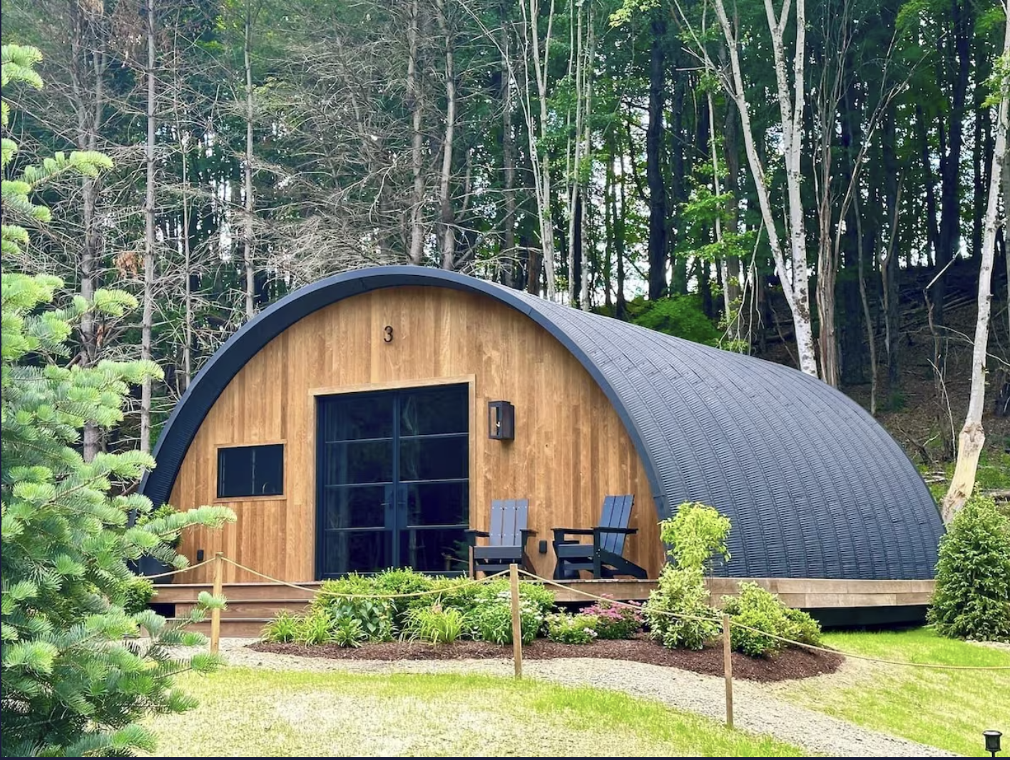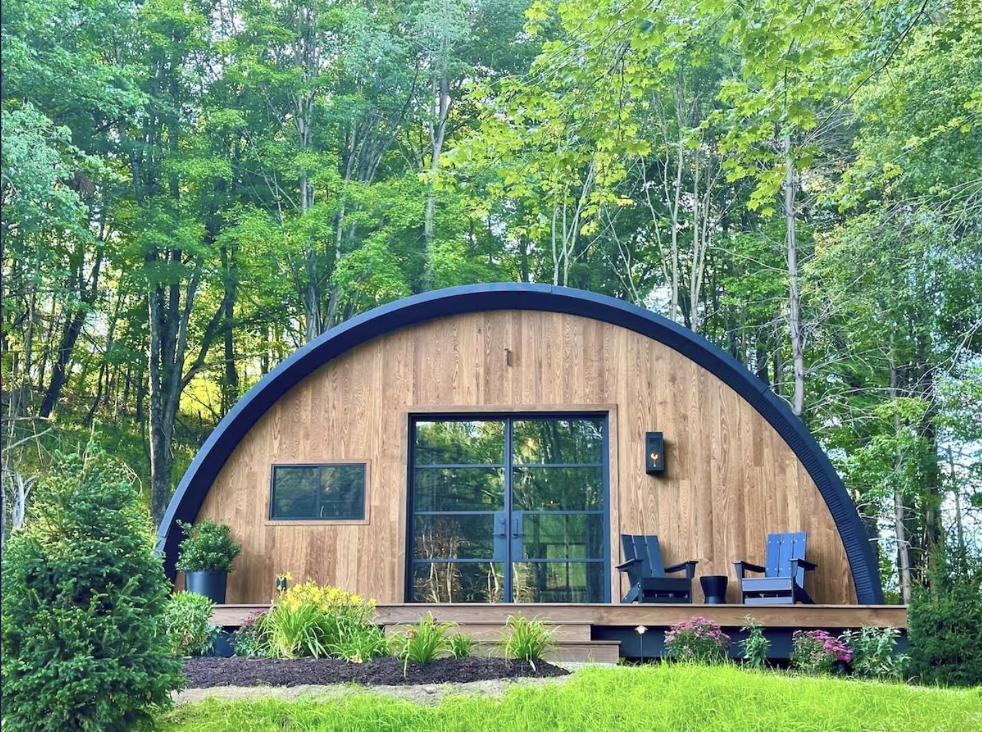 The June Farms Wellness Huts in West Sand Lake, New York, consists of a stunning 1,500-square-foot Quonset hut, which is a perfect mix of industrial design and tranquil nature. You can find there a 1-bathroom sanctuary designed for 3 people providing a full kitchen, pet-friendly amenities, air conditioning, free WiFi, outdoor space, and parking in a place that is ideal to relax and enjoy nature around Catskills’ gentle hills. The hut is excellent because of its extraordinary formation of the curved steel roof that rises like a protective dome over the land and merges smoothly with the woods and the meadows around.
