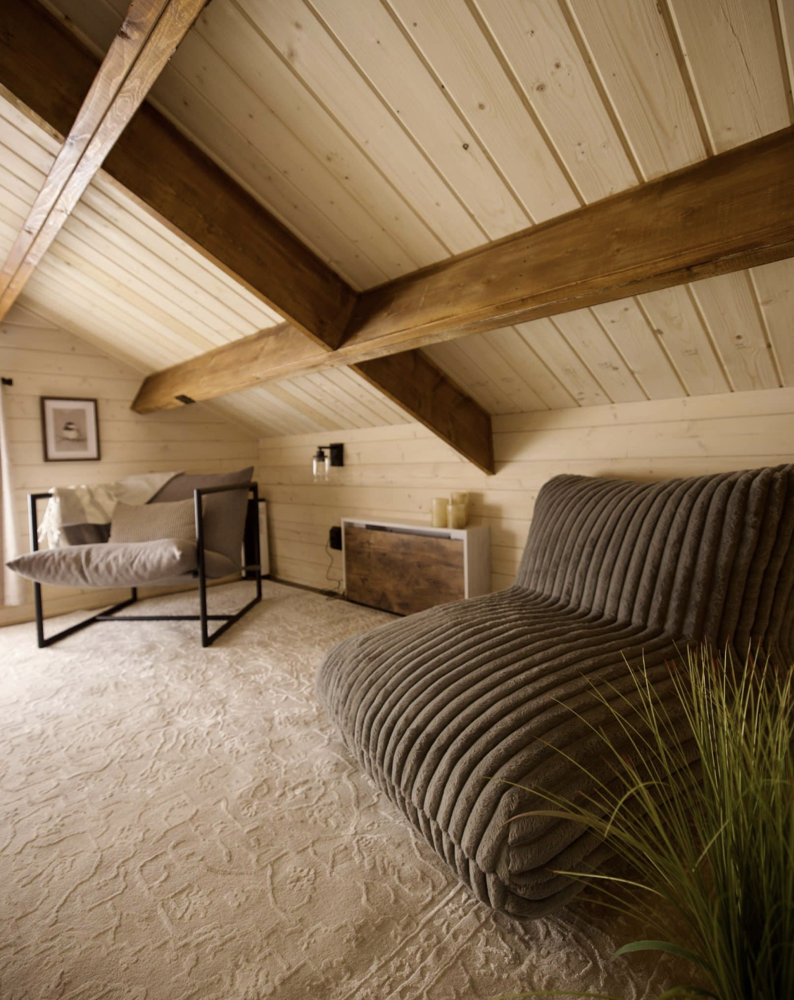 The bunkie offered comes as just a shell with an unfinished interior which shall be finished later on based on individual choices, available budget, and the purpose of use. It is a double loft structure of approximate 9 ft wall height with side sloping walls and a gable roof externally finished in shingles and optional metal coverings internally finished with OSB and vapor barriers.