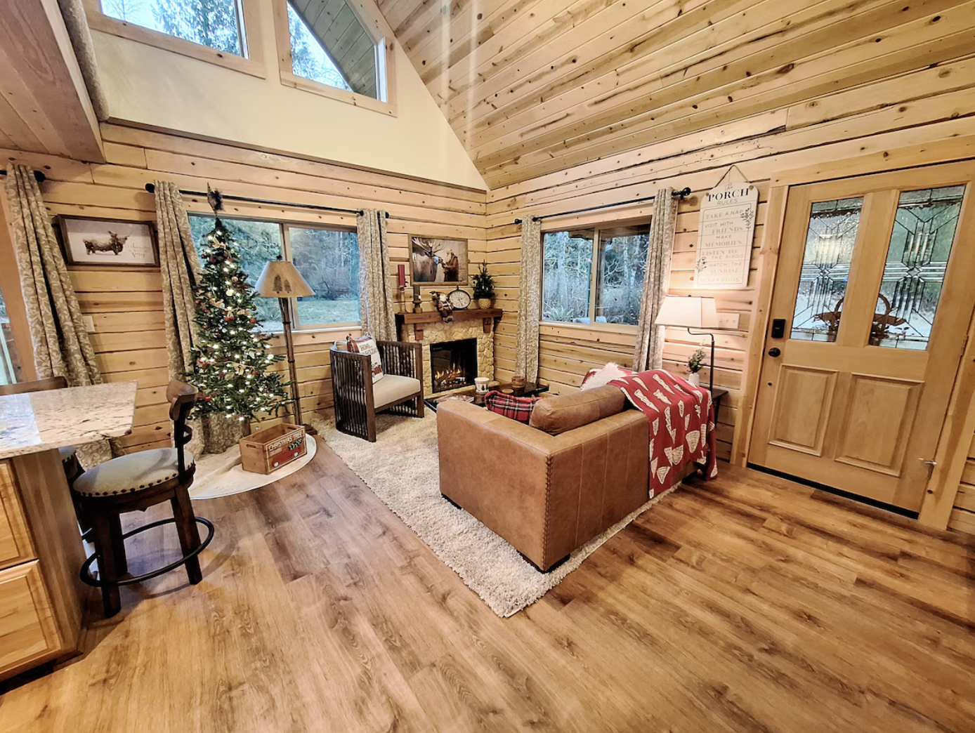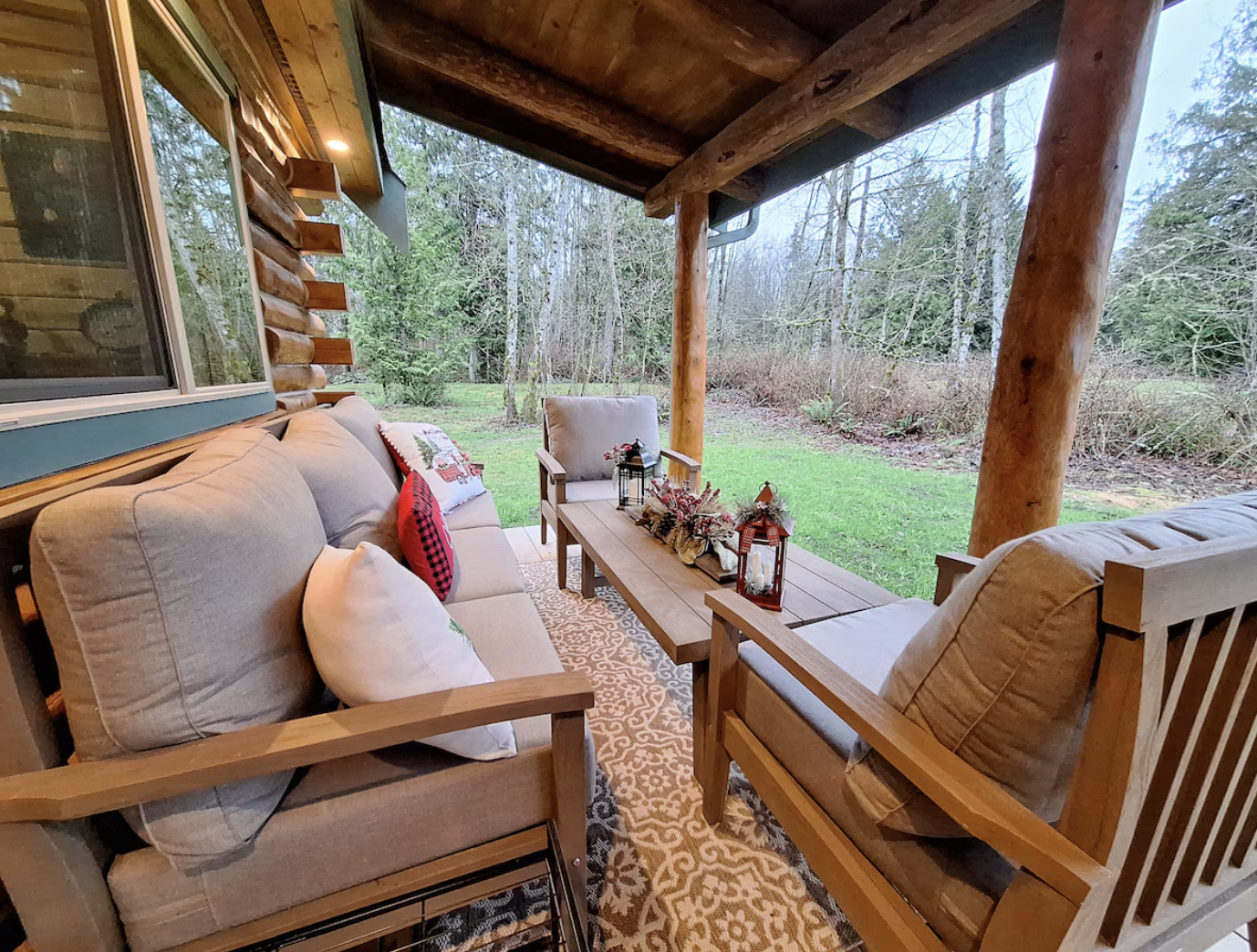 | Amenities | Covered porch, fireplace, full kitchen |