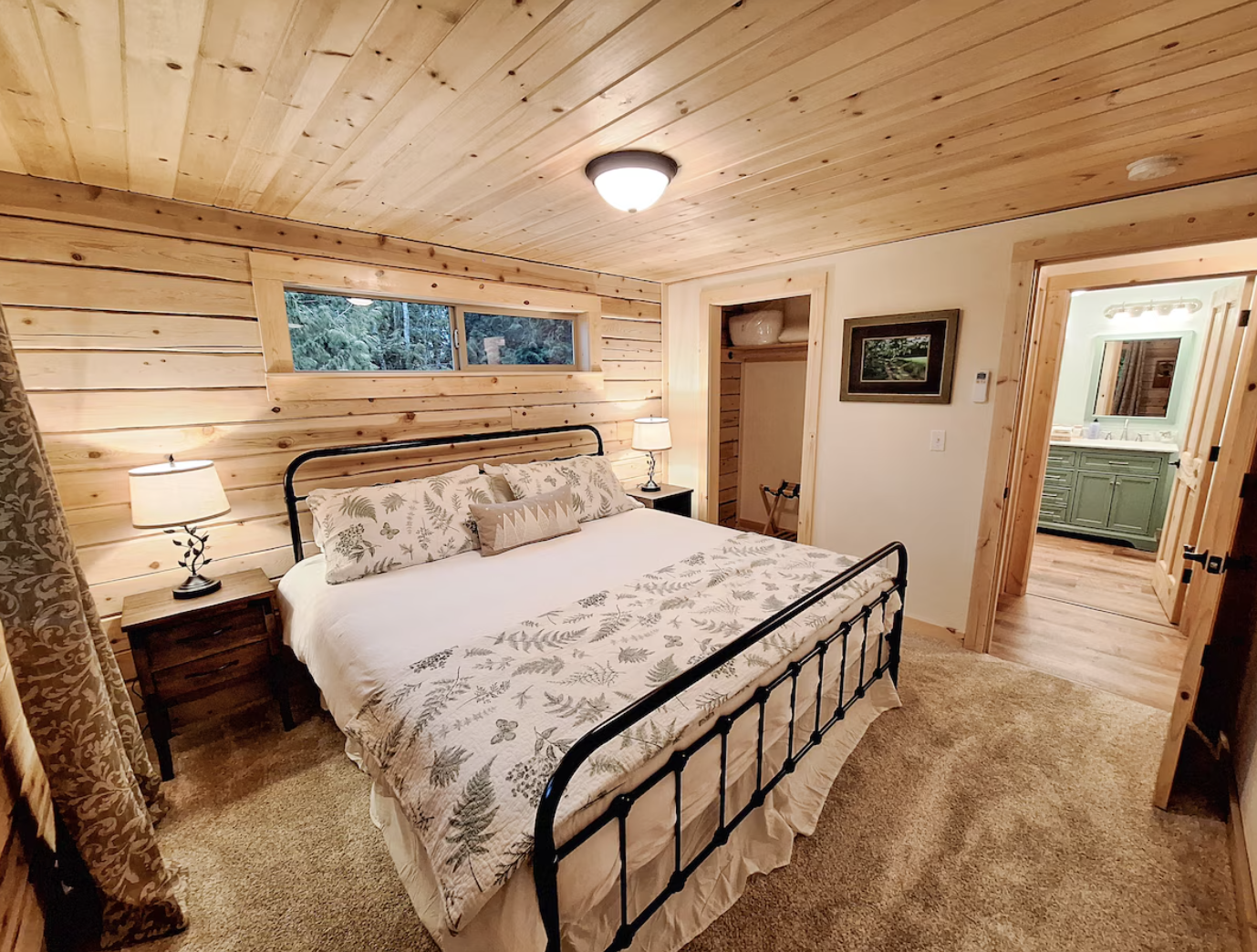 A guest room complements with the comfort level of the main one, as it also has a king bed set in a nice cozy corner. Here, the cabin’s inviting vibe is kept up, and the simple, soft bedding can be the quiet haven for you to fall into a deep sleep.