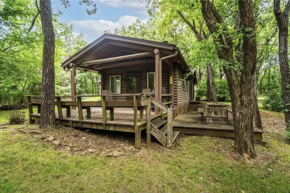 Situated on 10 scenic acres in Tonganoxie, Kansas, this charming log cabin is an idyllic… Inside This 3-Bedroom Log Cabin with Rustic Charm on 10 Acres